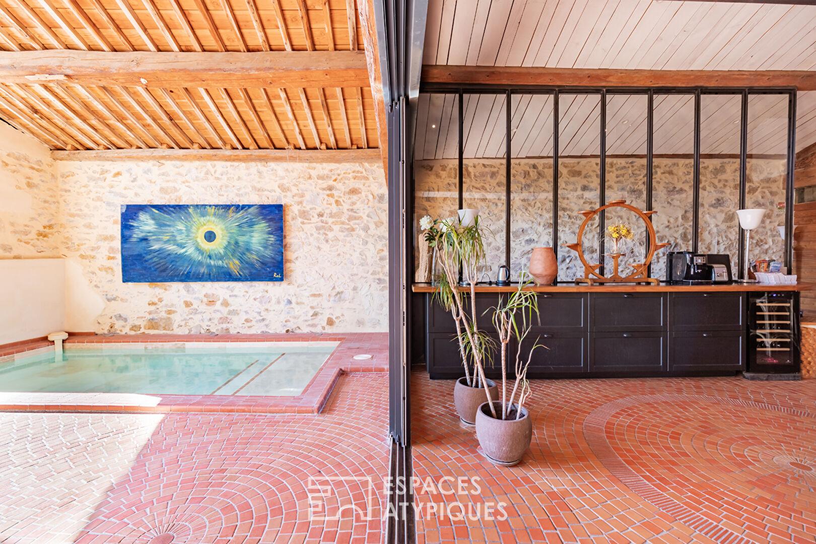 De l’autre côté de la galerie, le loft de prestige de 180 m² propose un univers à part : quatre suites de luxe climatisées, chacune avec salle de bain privative, un bar en bois exotique, une piscine intérieure bordée de briques anciennes, sous une majestueuse charpente apparente. Le lieu séduit par ses volumes, sa lumière, et ses ouvertures sur le canal.