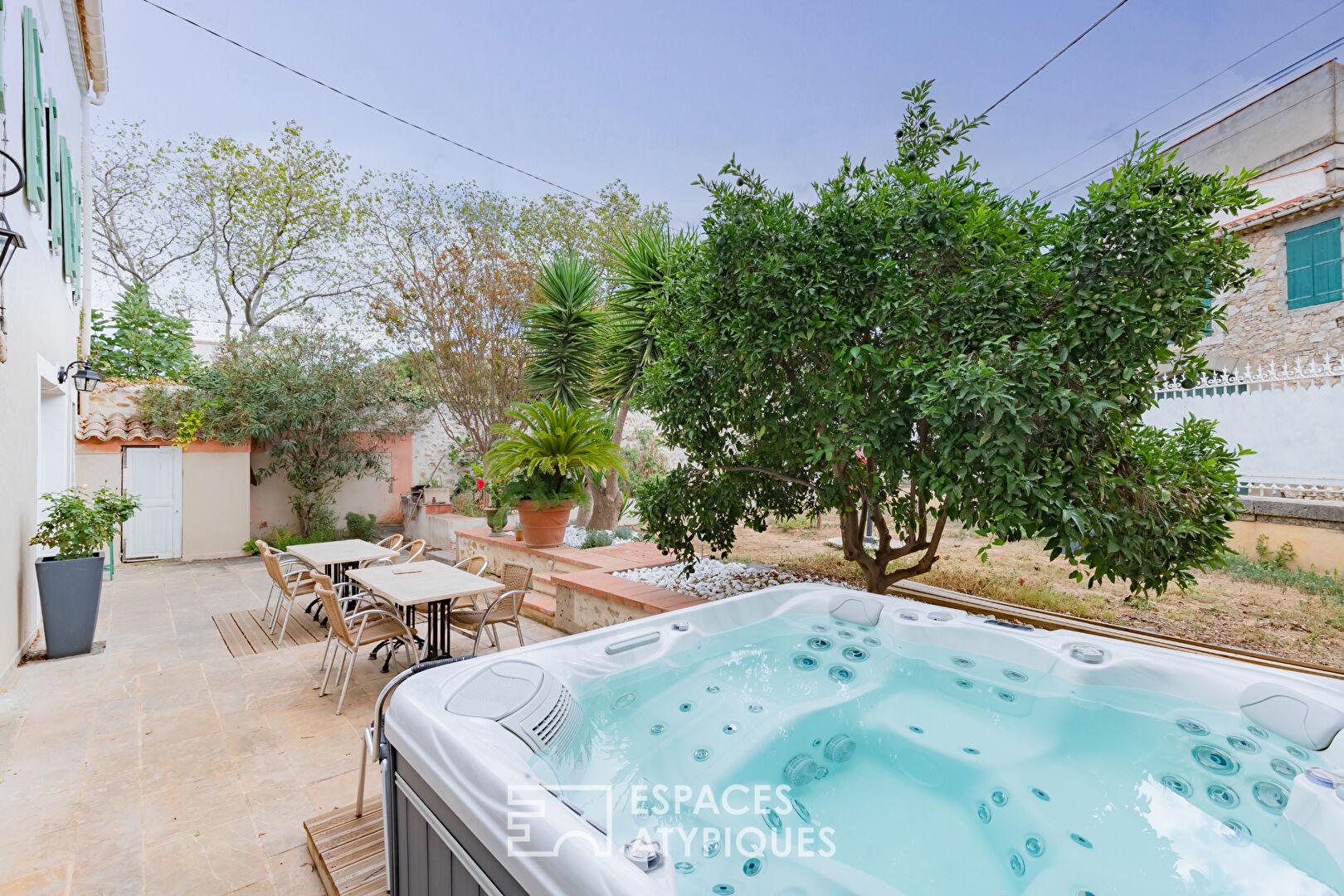 À l’extérieur, une terrasse ensoleillée accueille un espace bien-être avec jacuzzi, véritable atout pour séduire une clientèle en quête de confort et de détente. L’environnement est calme et recherché, à proximité des commodités.