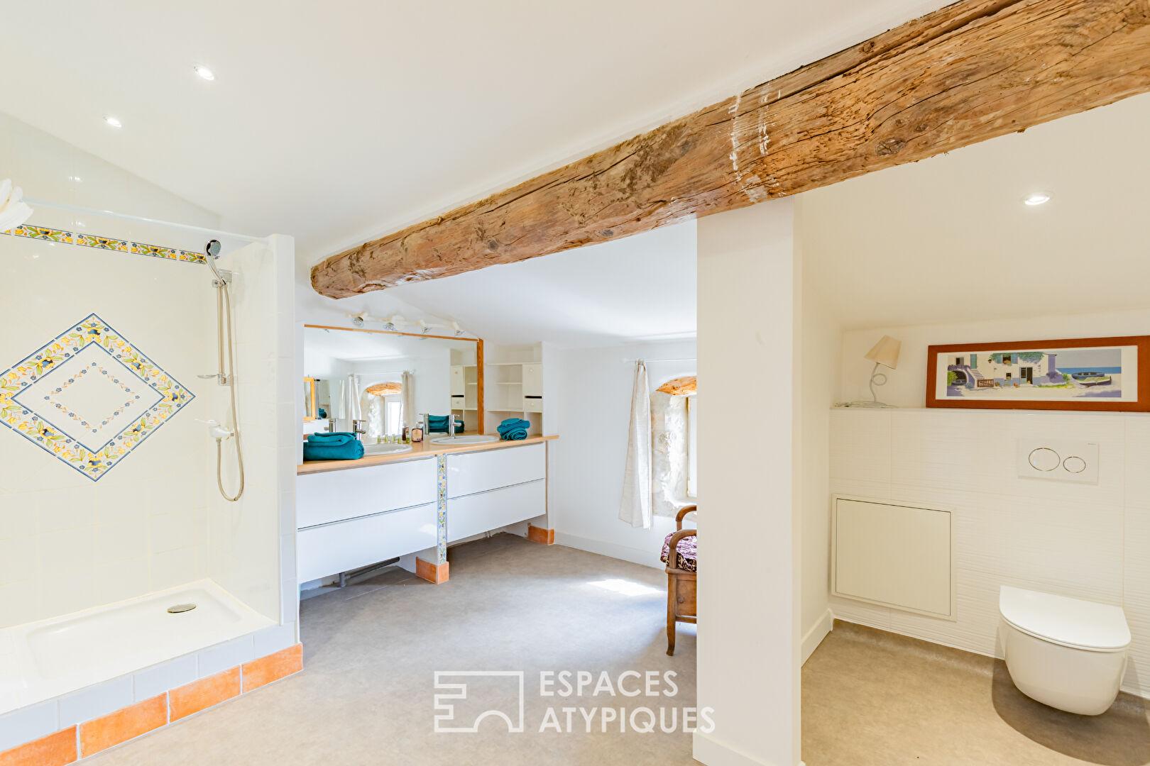 La partie privative propose un cadre de vie chaleureux avec un salon de caractère mettant en valeur poutres apparentes et murs en pierre. Elle dispose également de deux chambres supplémentaires, d’une salle de bain et d’une seconde cuisine, permettant de préserver une indépendance totale entre vie personnelle et activité professionnelle.
