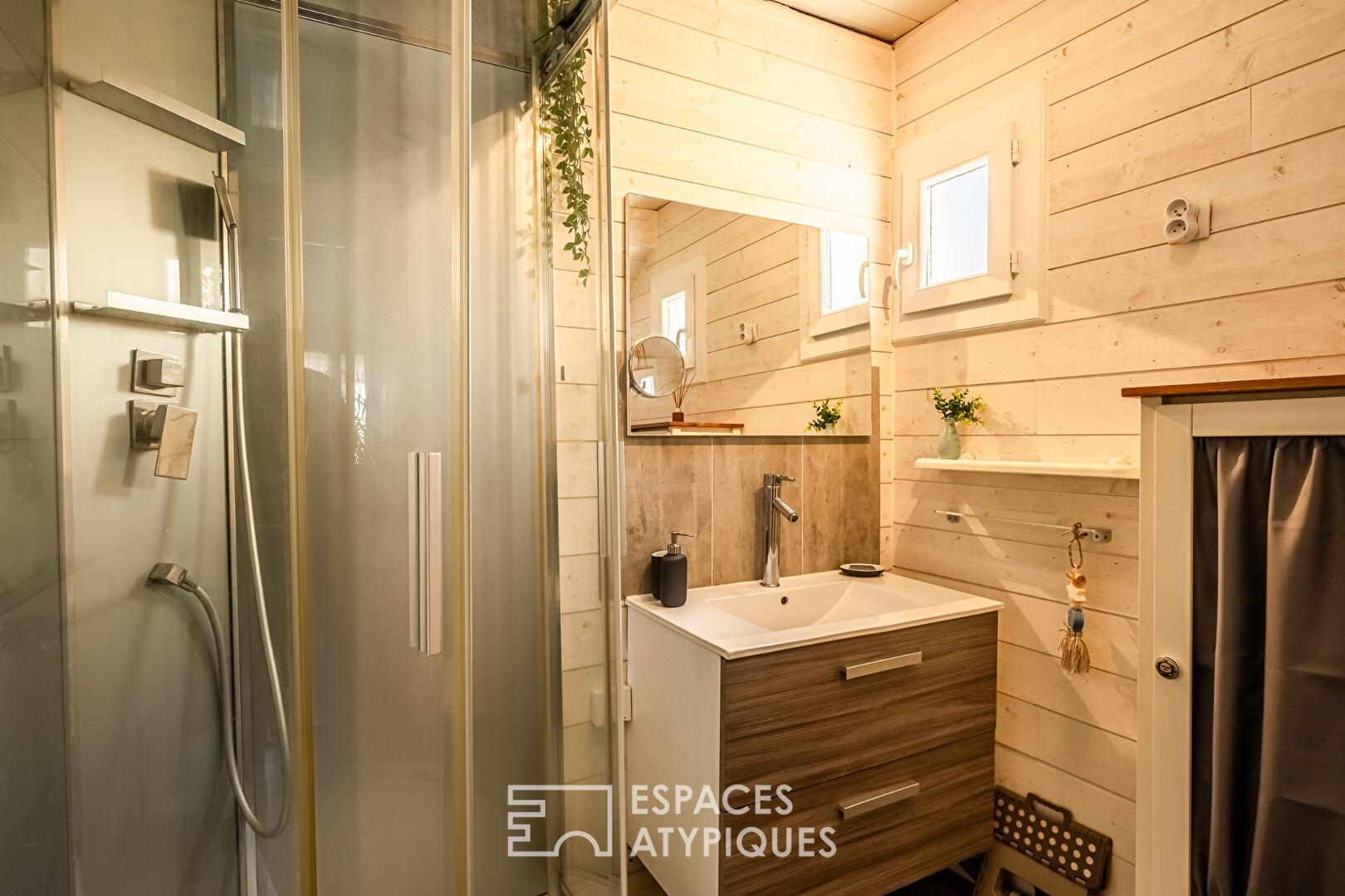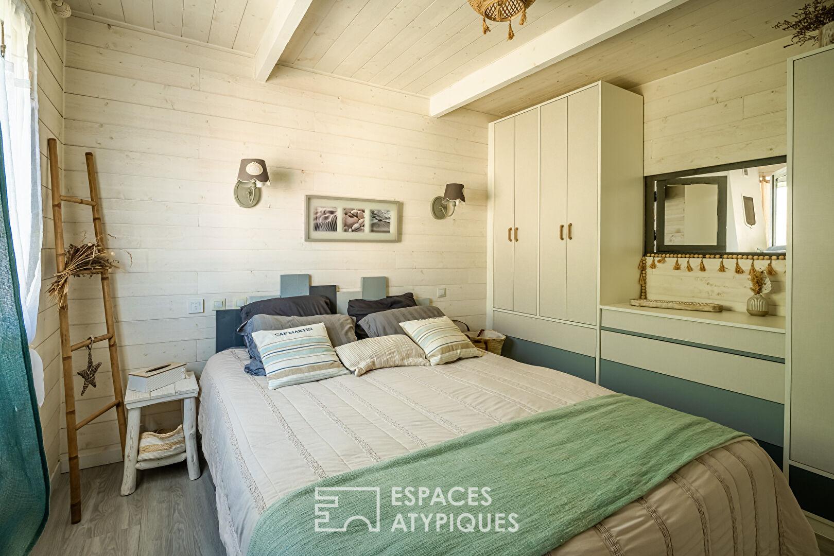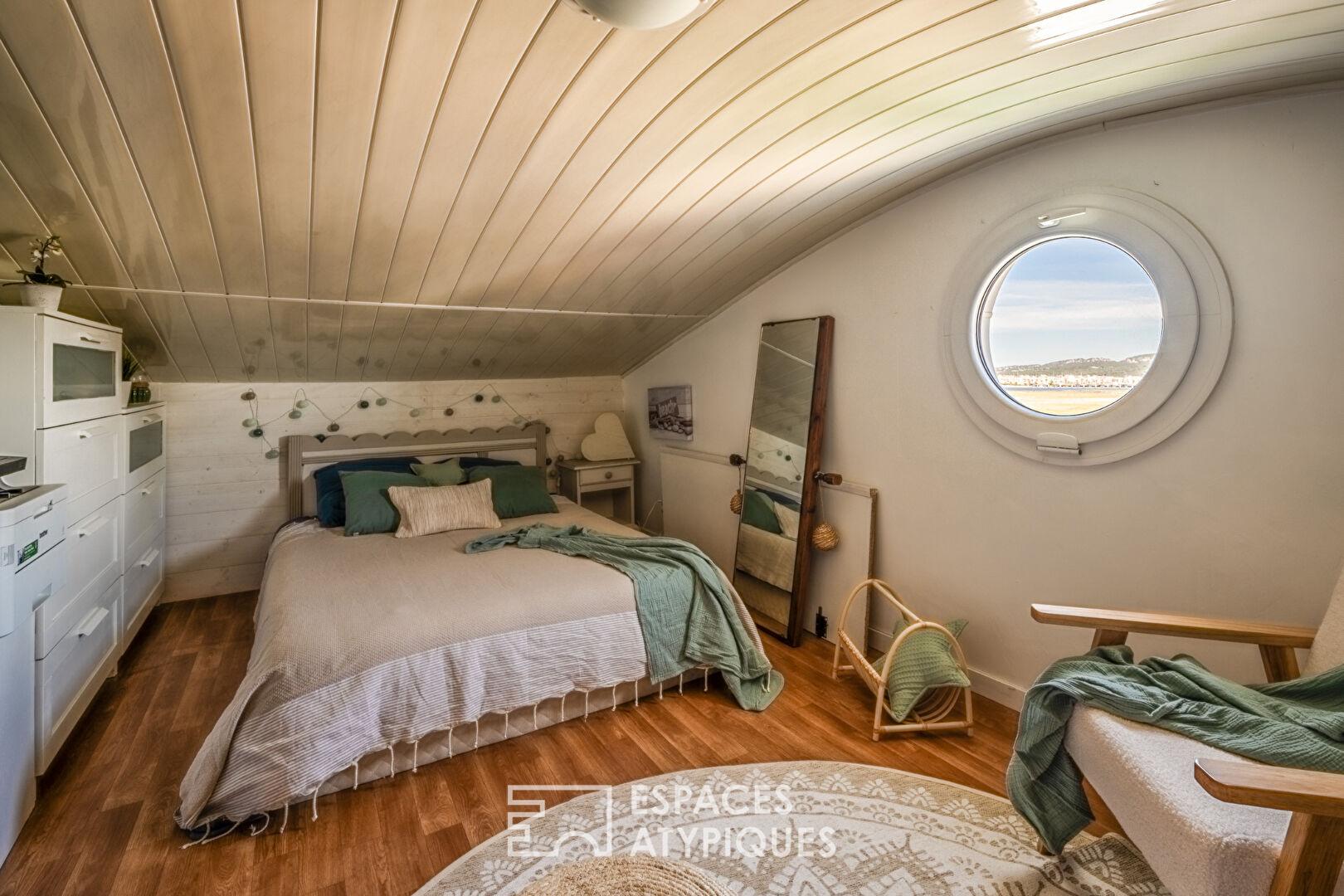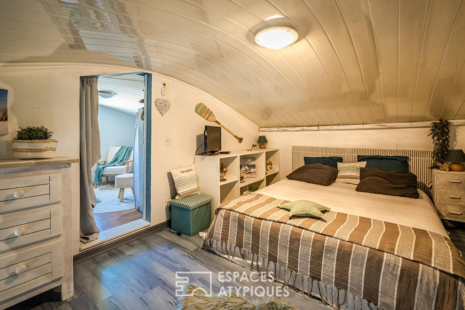 Une envolée de marches dévoile une mezzanine aux courbes singulières et au caractère résolument atypique accueillant deux chambres en enfilade, éclairées par une fenêtre de type hublot, qui apporte une lumière tamisée et souligne la personnalité unique de cette réalisation.
