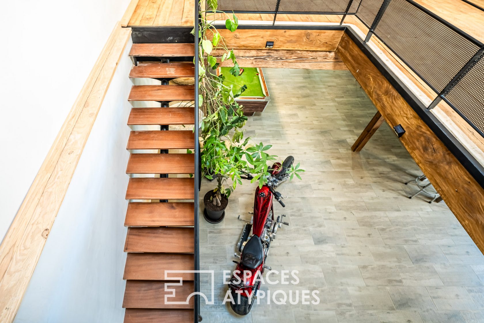 À l’étage, une mezzanine cathédrale baignée de lumière et deux autres pièces offrent des possibilités d’aménagement multiples : chambres, salles d’eau, bureau, salle de jeux ou atelier d’artiste.