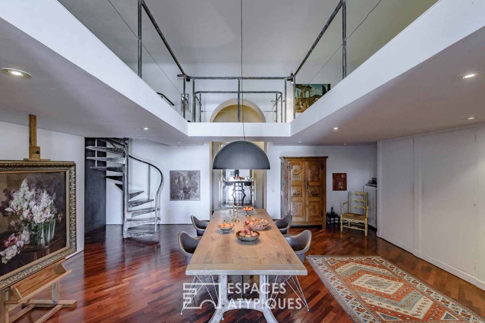 Les vastes volumes d’origines ont inspiré l’architecte en de longues mezzanines interconnectées, circulant au dessus des pièces à vivre comme un secret, les sols peints de fresques classiques pour renforcer la singularité de son caractère, unique.