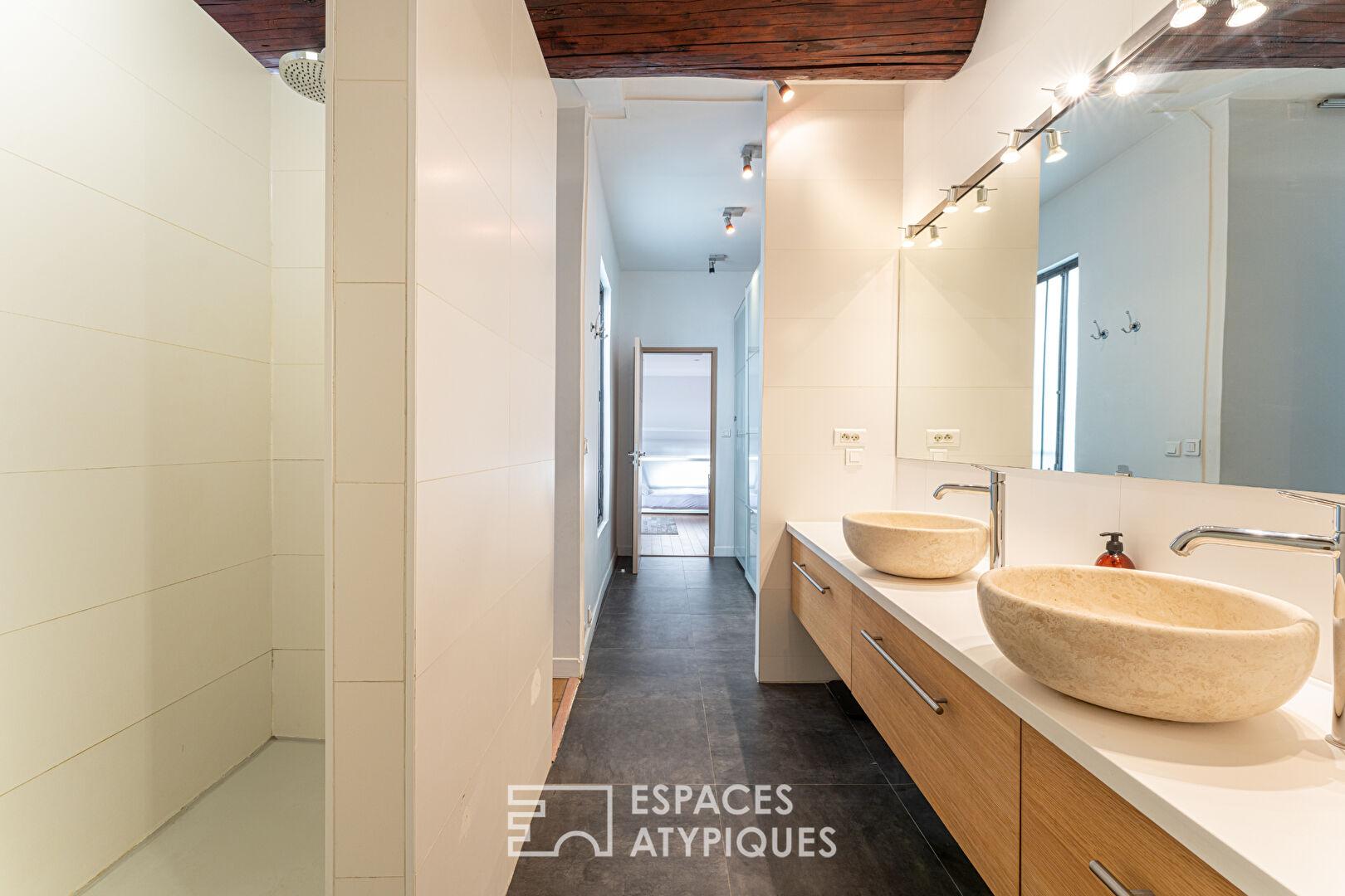La configuration en duplex offre une liberté d’usage rare. Chaque niveau dispose de sa propre entrée. Les espaces peuvent vivre ensemble ou séparément : recevoir, travailler, héberger, sans jamais contraindre l’organisation. Une modularité précieuse, pensée pour accompagner différents modes de vie.