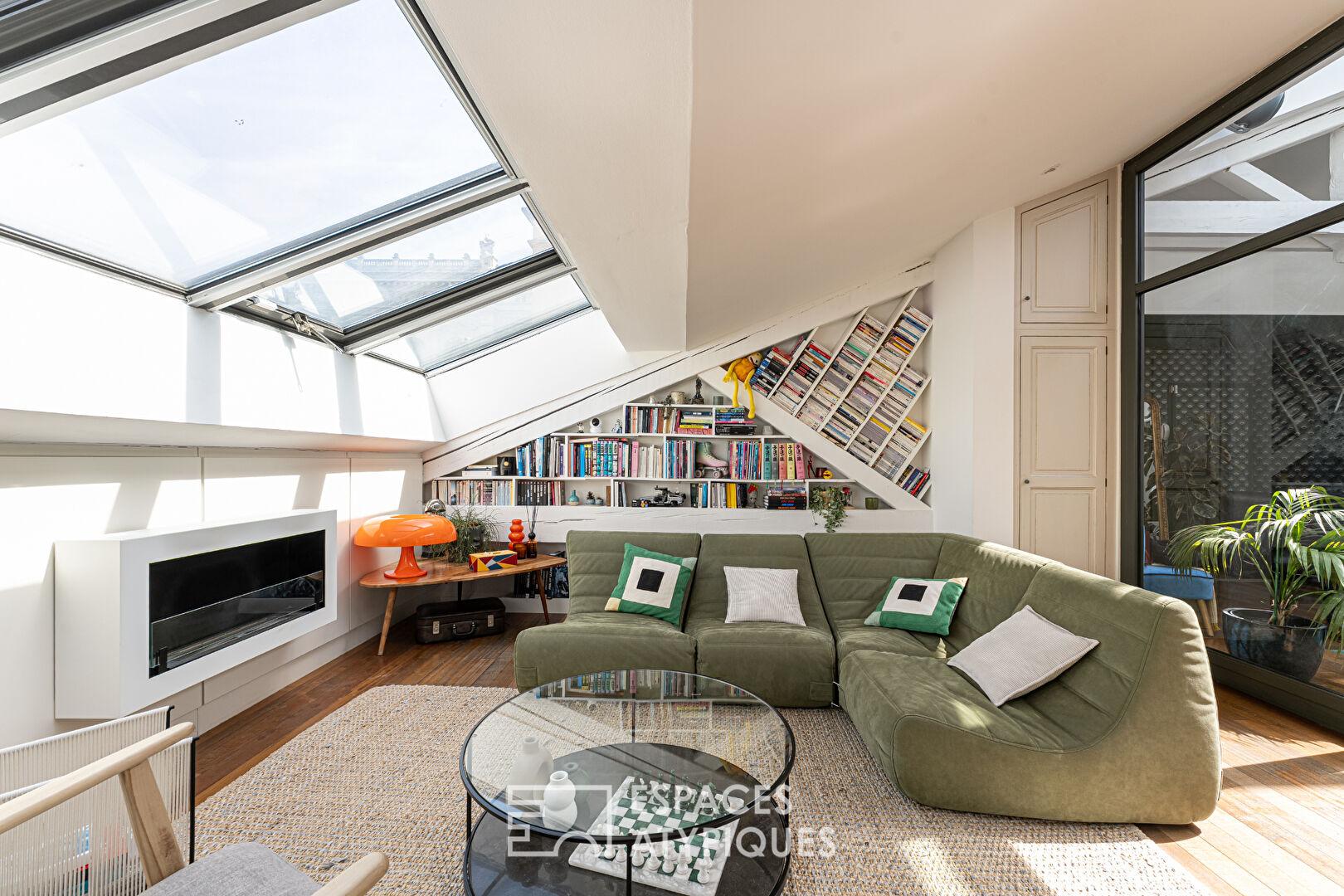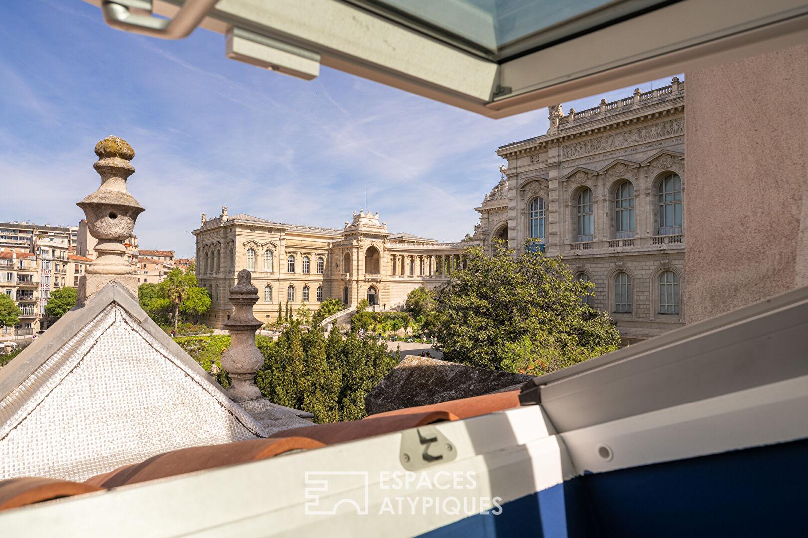 À deux pas du Palais Longchamp, dans le 4ème arrondissement de Marseille, ce dernier étage de 150 m² habitables prend place au sein d’un immeuble ancien à l’architecture préservée.