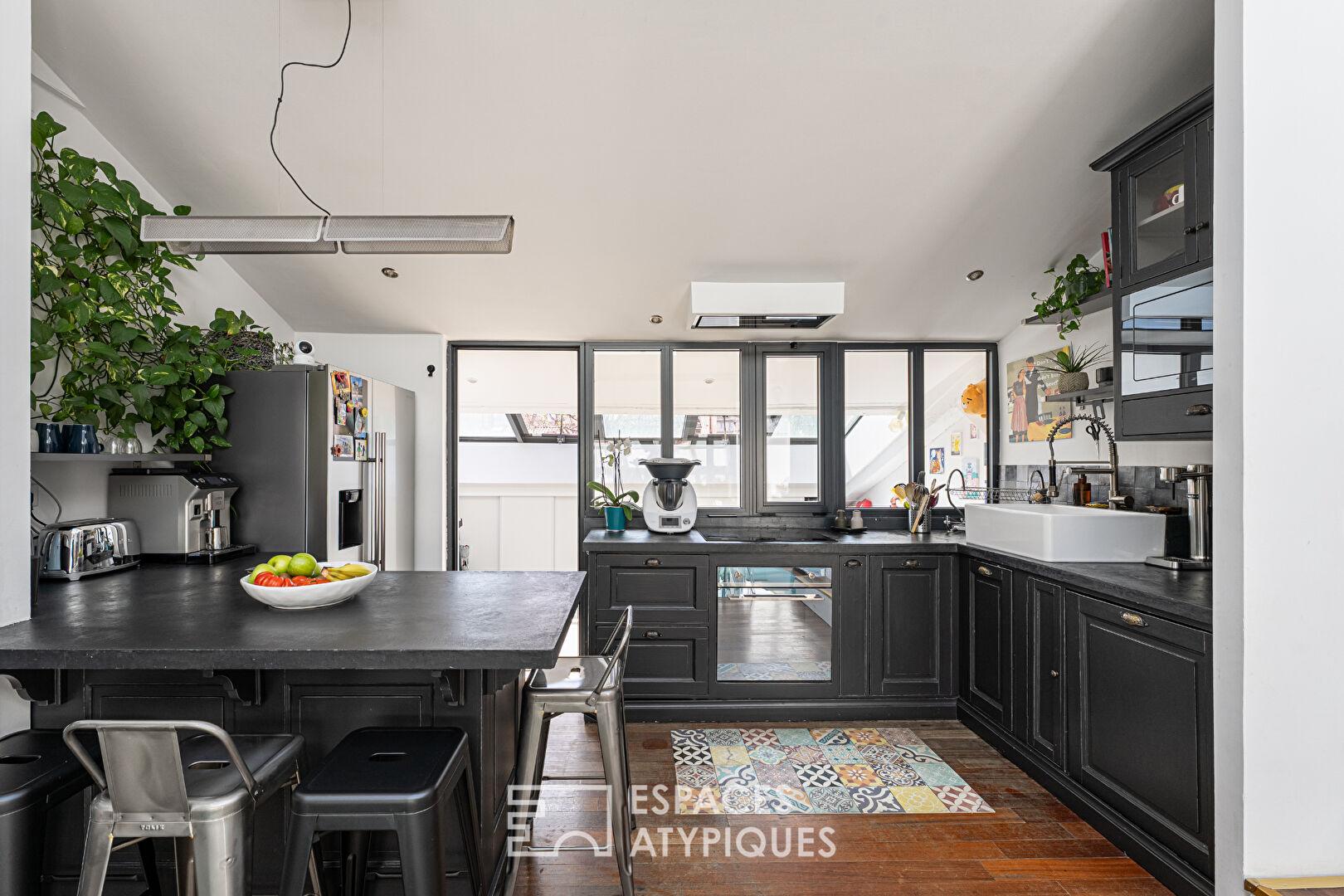 Derrière la cuisine, sous une verrière orientée plein sud, un espace se distingue par sa luminosité constante et son ouverture côté cour, au calme absolu.