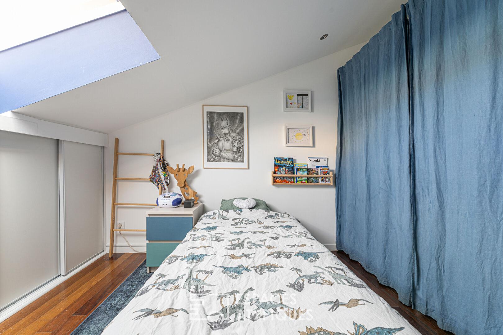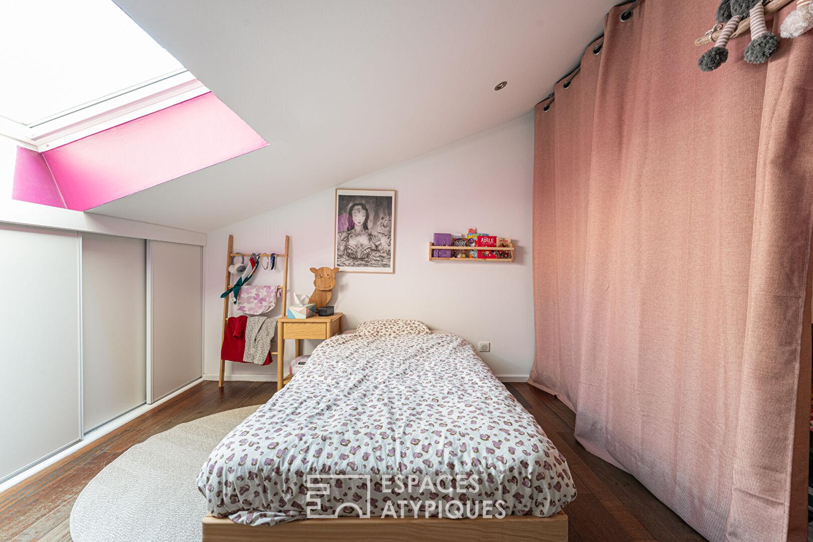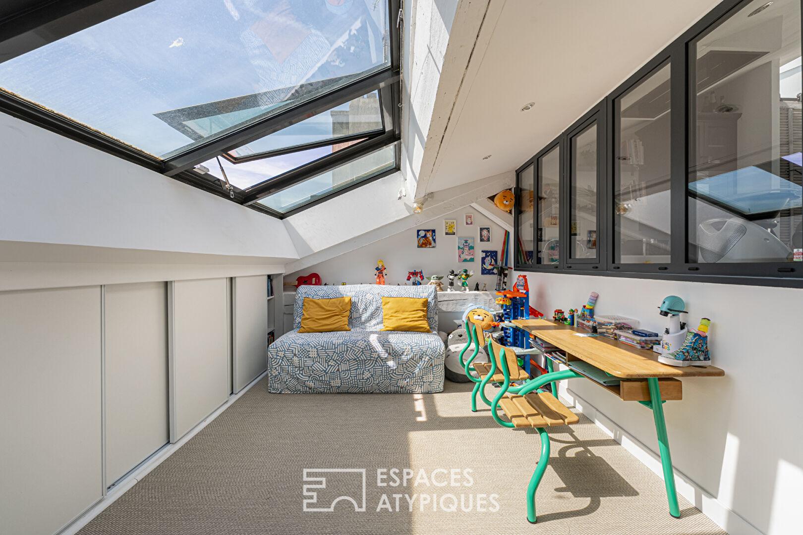 L’ensemble révèle un bien singulier, porté par de beaux volumes et de larges verrières. La lumière naturelle circule tout au long de la journée. La hauteur sous plafond du séjour dialogue avec des espaces sous toiture à l’atmosphère plus intime.