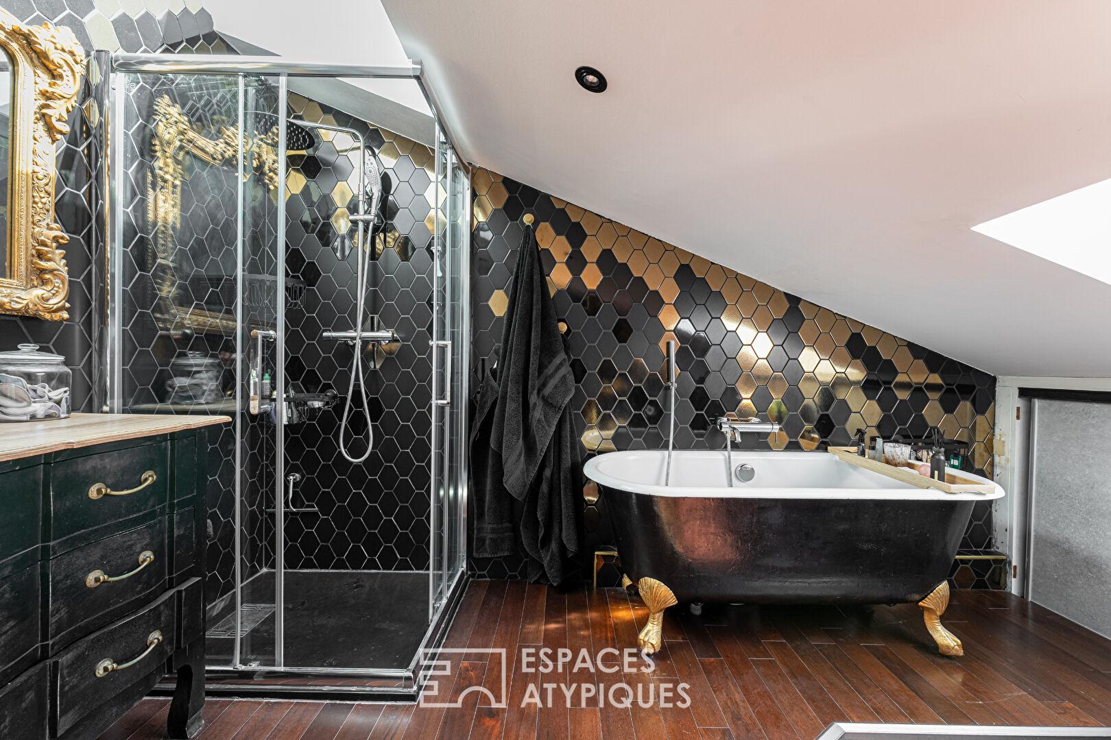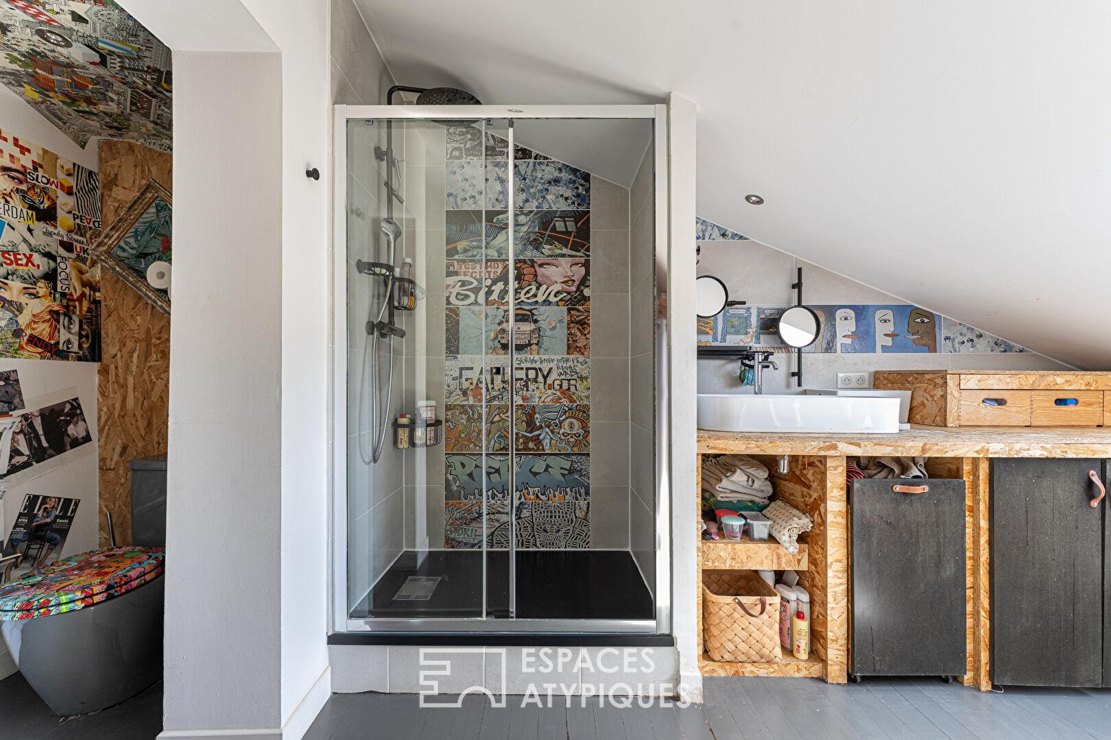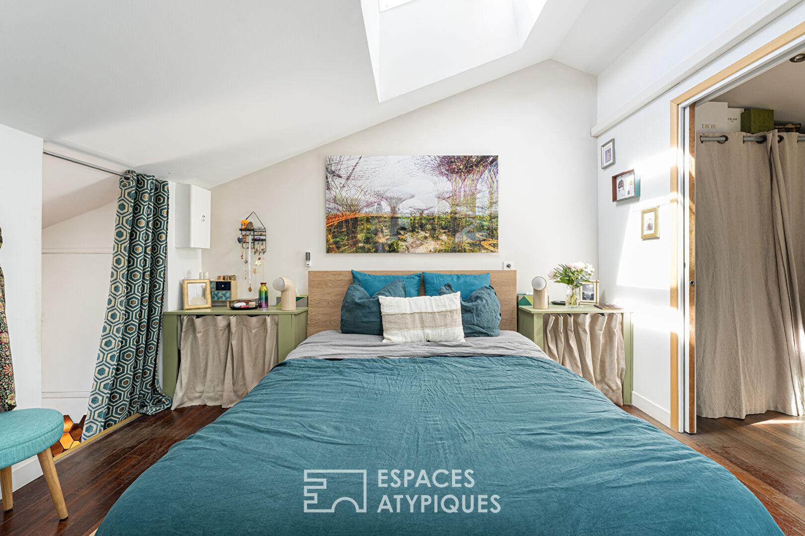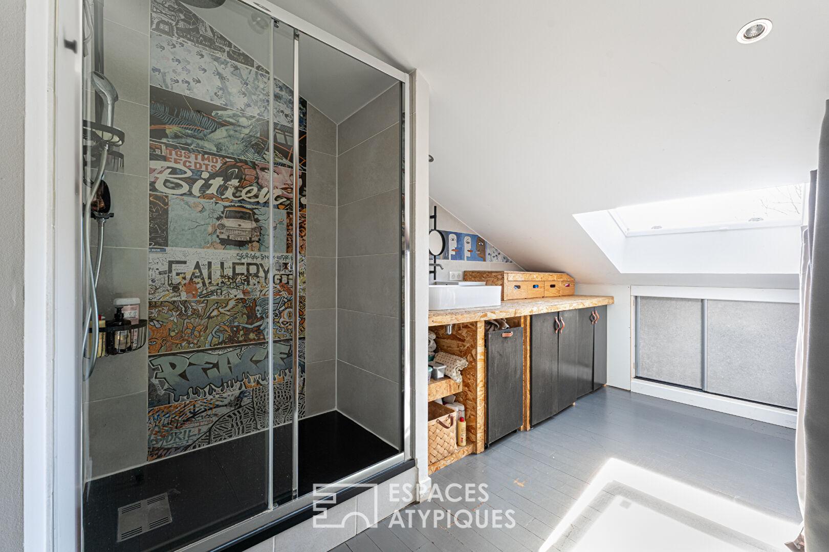 L’ensemble révèle un bien singulier, porté par de beaux volumes et de larges verrières. La lumière naturelle circule tout au long de la journée. La hauteur sous plafond du séjour dialogue avec des espaces sous toiture à l’atmosphère plus intime.