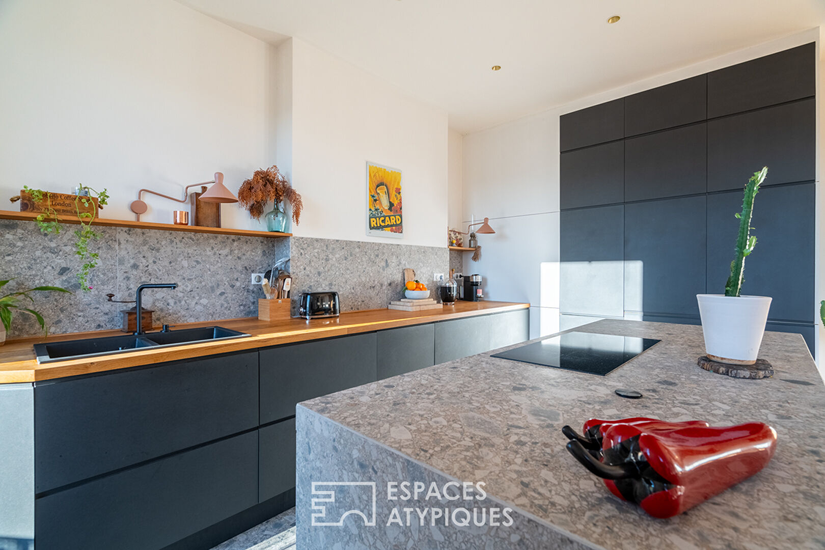 La prise en main des espaces a été pensée en termes de volumes et de décloisonnement pour créer une habitation inédite dans laquelle la circulation est fluide et guidée par la lumière. Traversant, le lieu joue avec habileté entre perspective et optimisation des espaces.