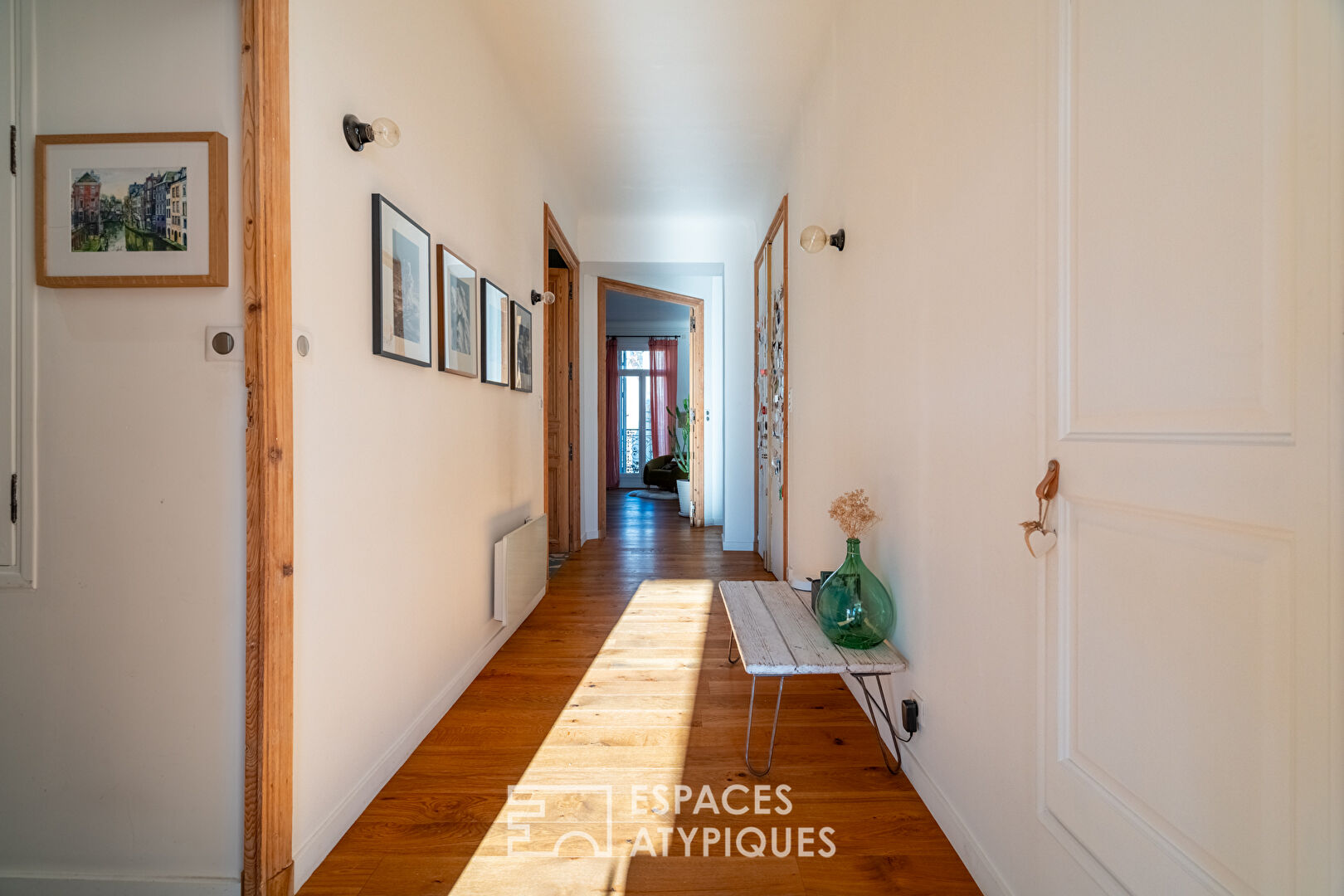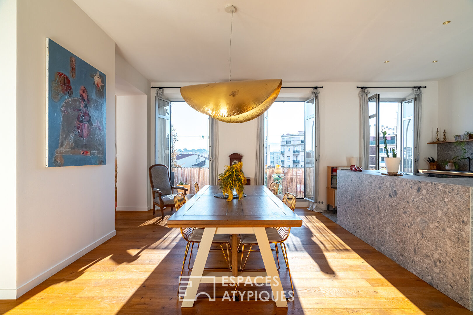 La pièce à vivre profite d’un généreux volume qui englobe une cuisine moderne et fonctionnelle le tout ouvert sur un balcon qui file sur toute la largeur. Une chambre parentale avec dressing et une deuxième chambre composent le coin nuit. Une élégante salle de bain avec baignoire et douche complète le lieu. Une cave et de nombreux rangements s’ajoutent aux atouts de ce cocon urbain.