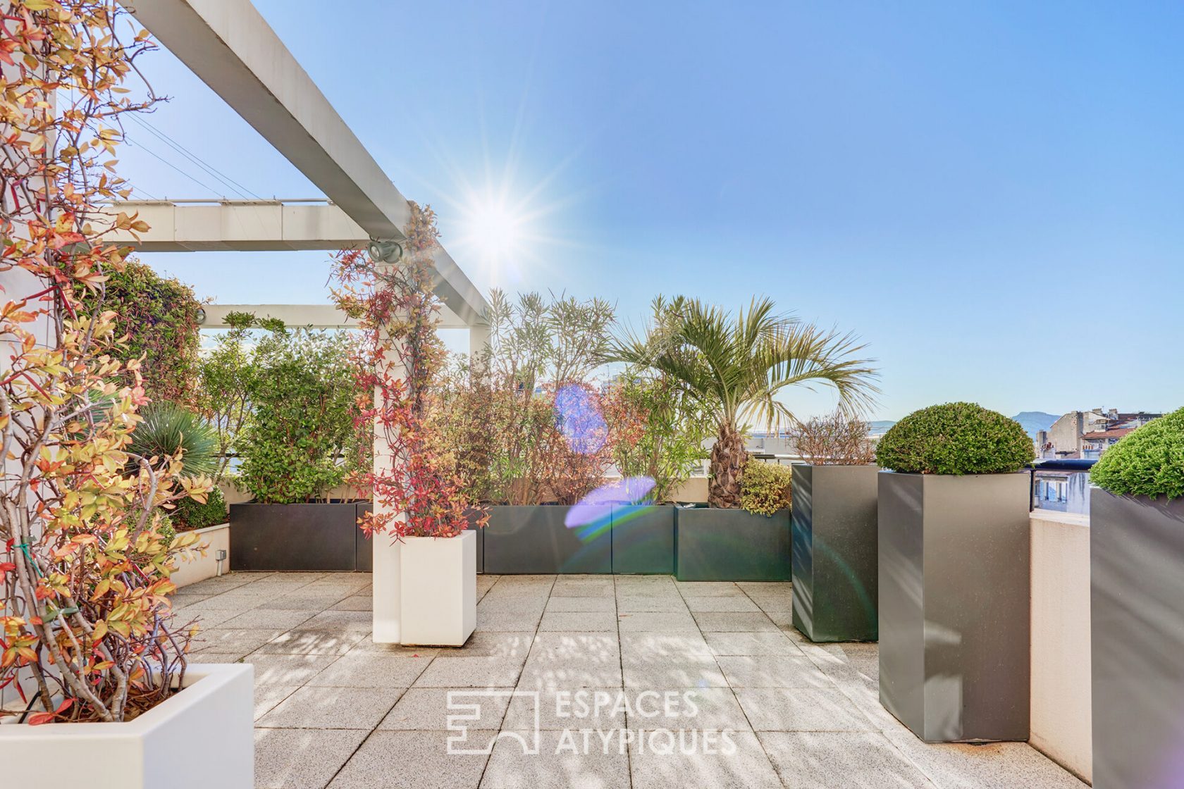 Dans un esprit contemporain, le bel espace de vie s’articule autour d’une délicate verrière qui fait la liaison entre la cuisine et le salon, augmenté d’une terrasse plein ciel de 40m² orienté plein sud avec vue panoramique sur Notre Dame de la Garde. Coté nuit, trois chambres, dont une master avec dressing et balcon, se partagent une salle de bain et un espace buanderie.