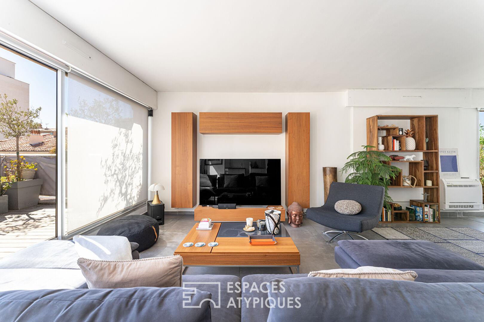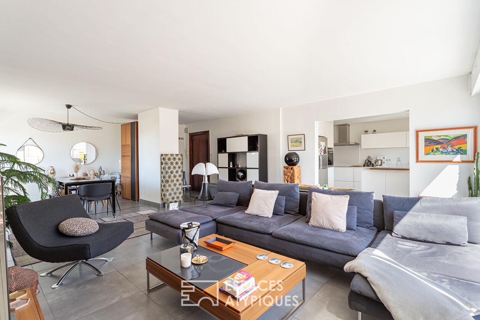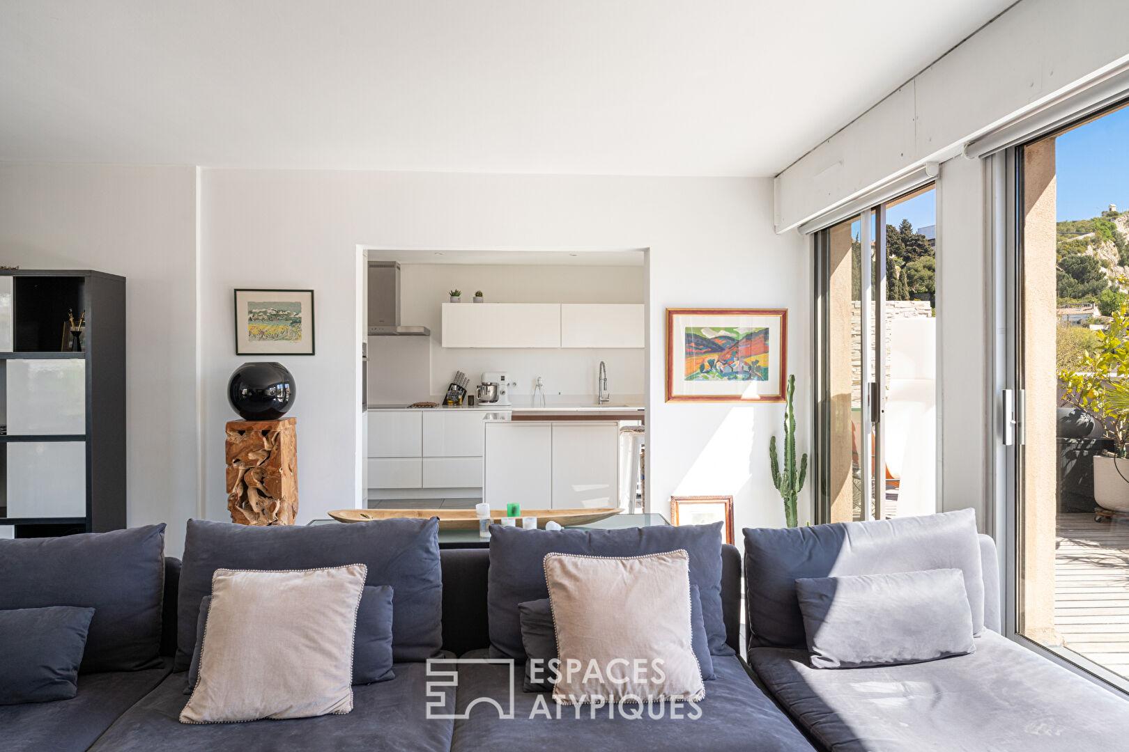 Dès l’entrée, les volumes s’organisent avec fluidité autour d’une pièce de vie centrale. Le séjour s’ouvre sur une terrasse exposée plein sud, véritable prolongement de l’espace intérieur. La vue se déploie face à Notre-Dame de la Garde et qui offre un tableau emblématique de Marseille.