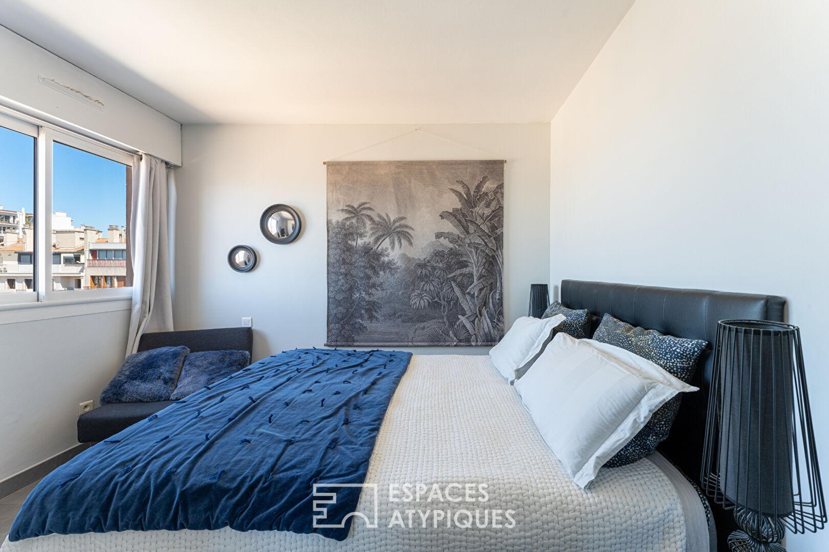 L’appartement propose aujourd’hui une configuration en trois pièces, avec la possibilité d’aménager une troisième chambre selon les besoins. L’espace nuit se compose de deux chambres, dont une suite parentale. L’une d »elle s’ouvre sur un balcon orienté à l’ouest, avec une vue dégagée sur la mer et les toits de Marseille. Ce second extérieur apporte une respiration supplémentaire et accompagne les lumières de fin de journée.