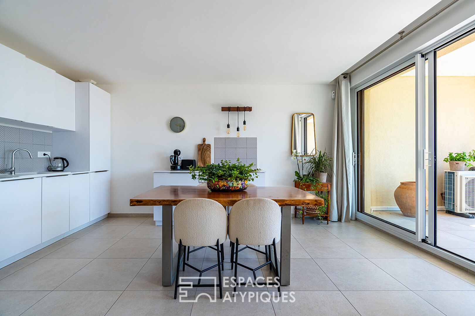 Les larges baies vitrées rythment les espaces et offrent une luminosité constante, créant une véritable continuité entre intérieur et extérieur. Le cadre de vie s’organise autour d’une belle pièce principale à la composition singulière et parfaitement équilibrée. La cuisine ouverte, prolongée par un espace salle à manger convivial, dialogue harmonieusement avec un séjour distinct, pensé comme un espace de détente. L’ensemble se prolonge naturellement vers la terrasse, véritable extension de l’appartement propice aux moments de calme et de convivialité.