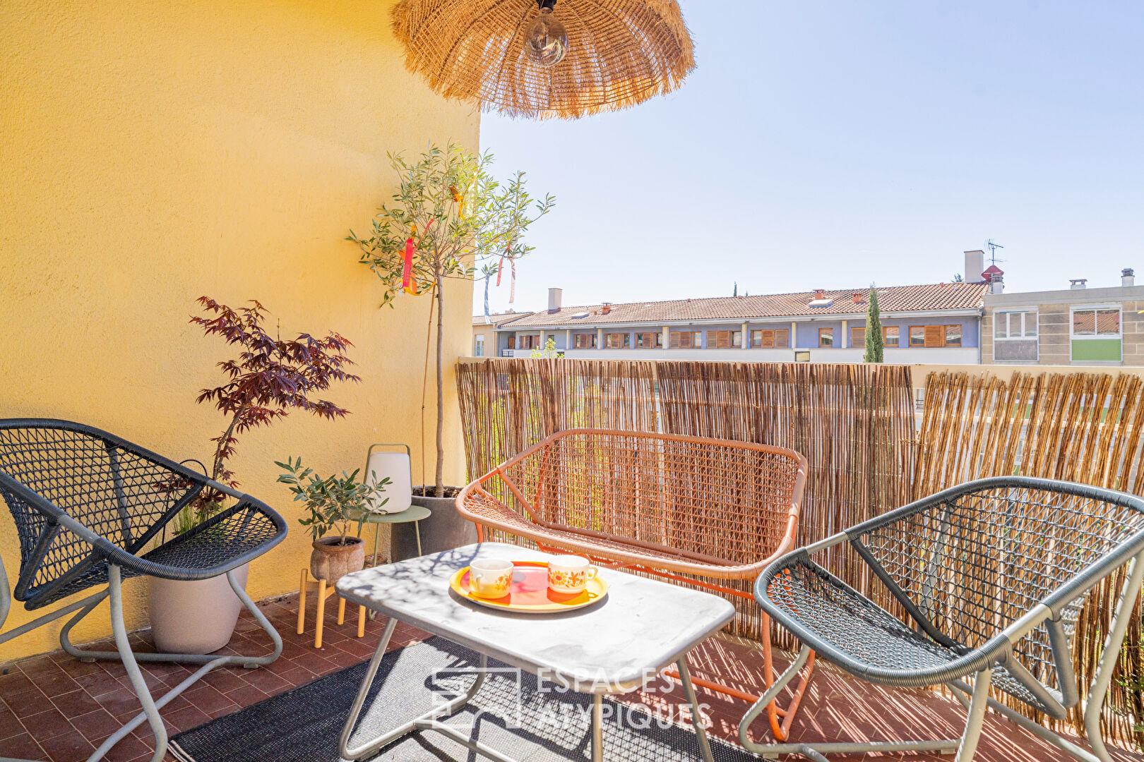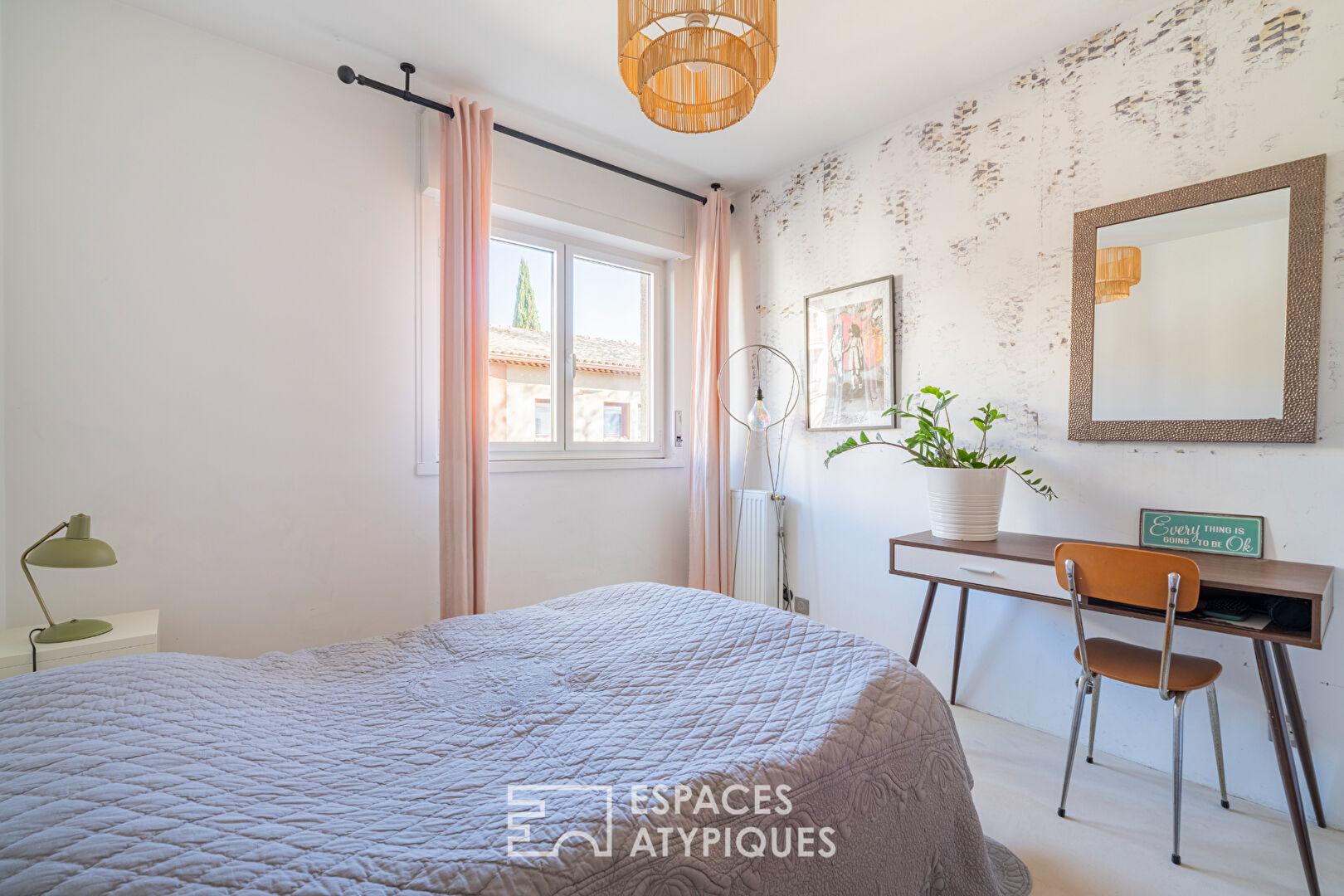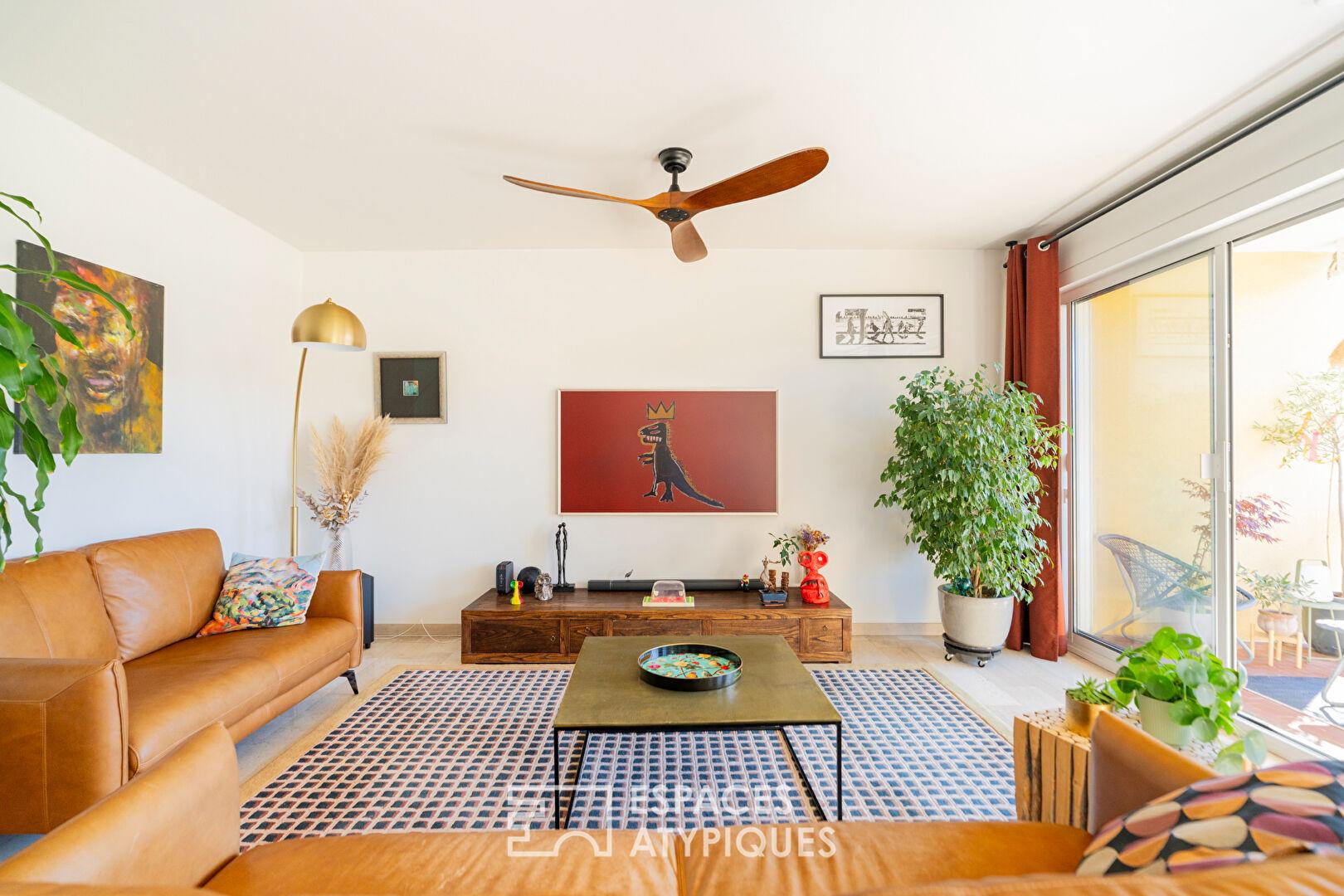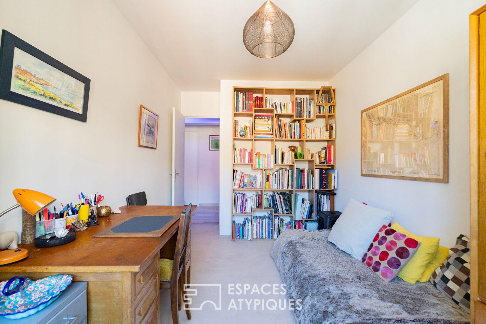 L’entrée distribue un bel espace de vie orienté plein sud, véritable coeur de l’appartement. Baigné de lumière naturelle grâce à de larges ouvertures et climatisé, le séjour dévoile une atmosphère chaleureuse, sublimée par un élégant sol en marbre et prolongée par un long balcon. La cuisine indépendante, fonctionnelle et bien équipée, se distingue par son sol en béton ciré et s’ouvre sur un second extérieur plus intimiste. L’espace nuit accueille cinq chambres bien réparties, dont une chambre parentale agrémentée d’un dressing. Les sols en béton ciré, présents dans les chambres et la cuisine, apportent une signature contemporaine et élégante à l’ensemble. Une salle de bain, une salle d’eau ainsi que de nombreux rangements viennent compléter ce bien.