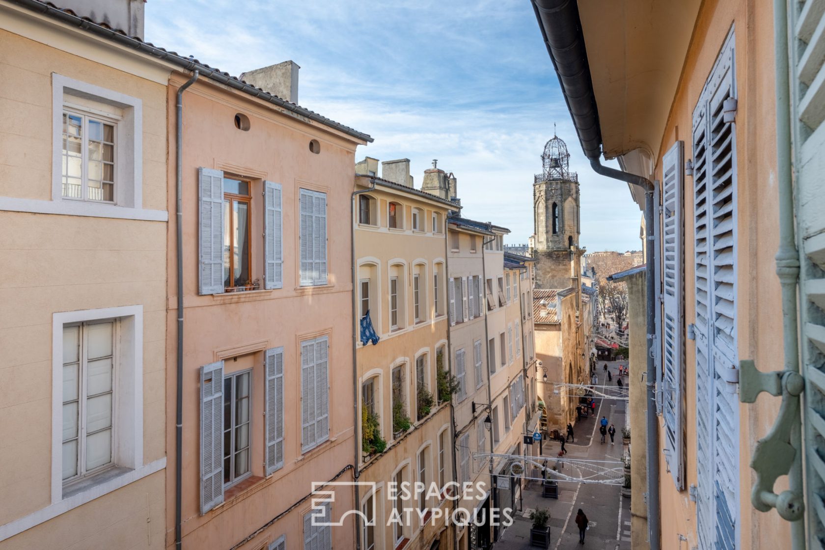 Situé à deux pas du célèbre cours Mirabeau, rue Espariat, cet appartement de charme entièrement rénové de 57 m² (loi carrez), prend place au troisième étage sans ascenseur d’un bel immeuble du 18ème siècle avec d’élégantes parties communes.