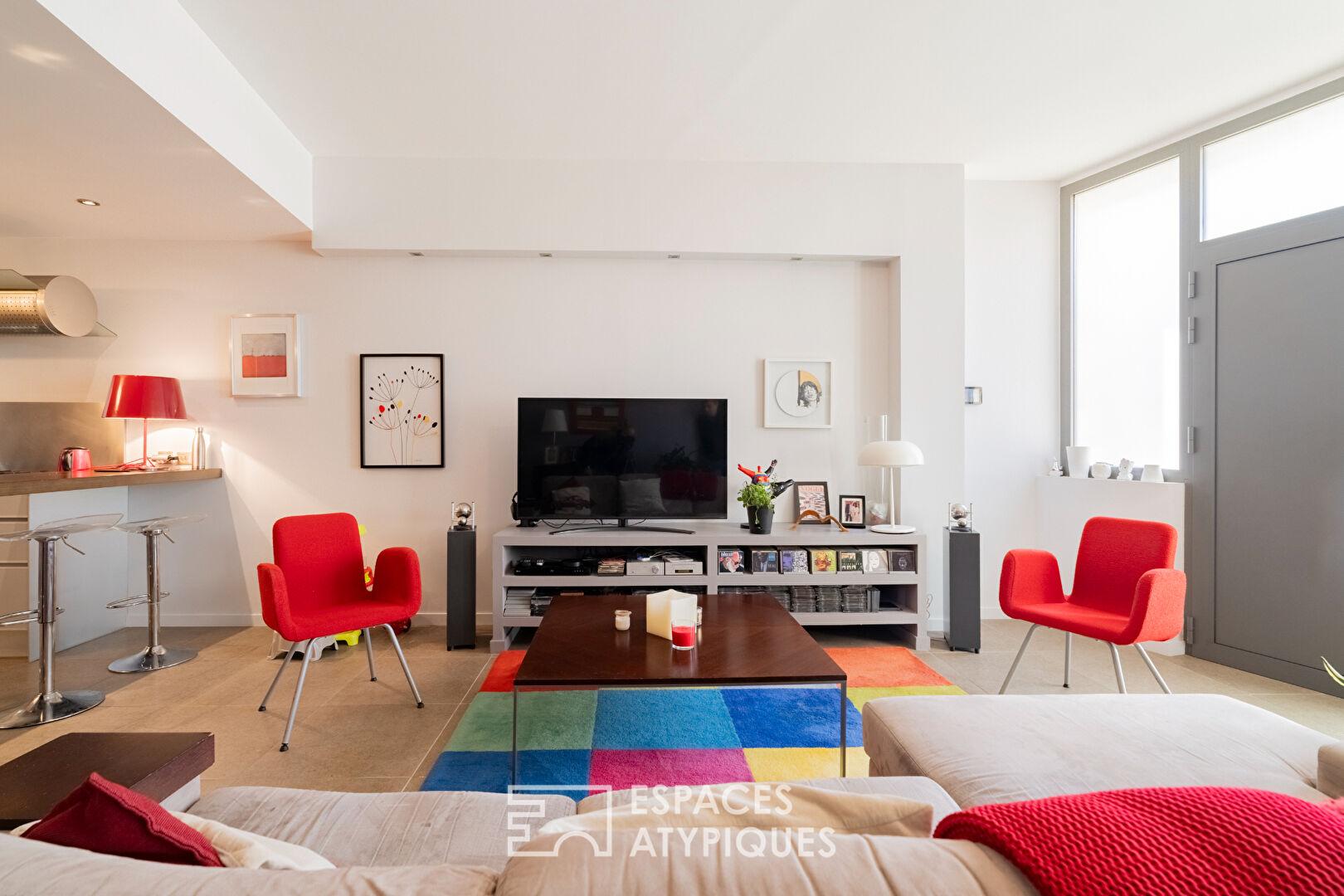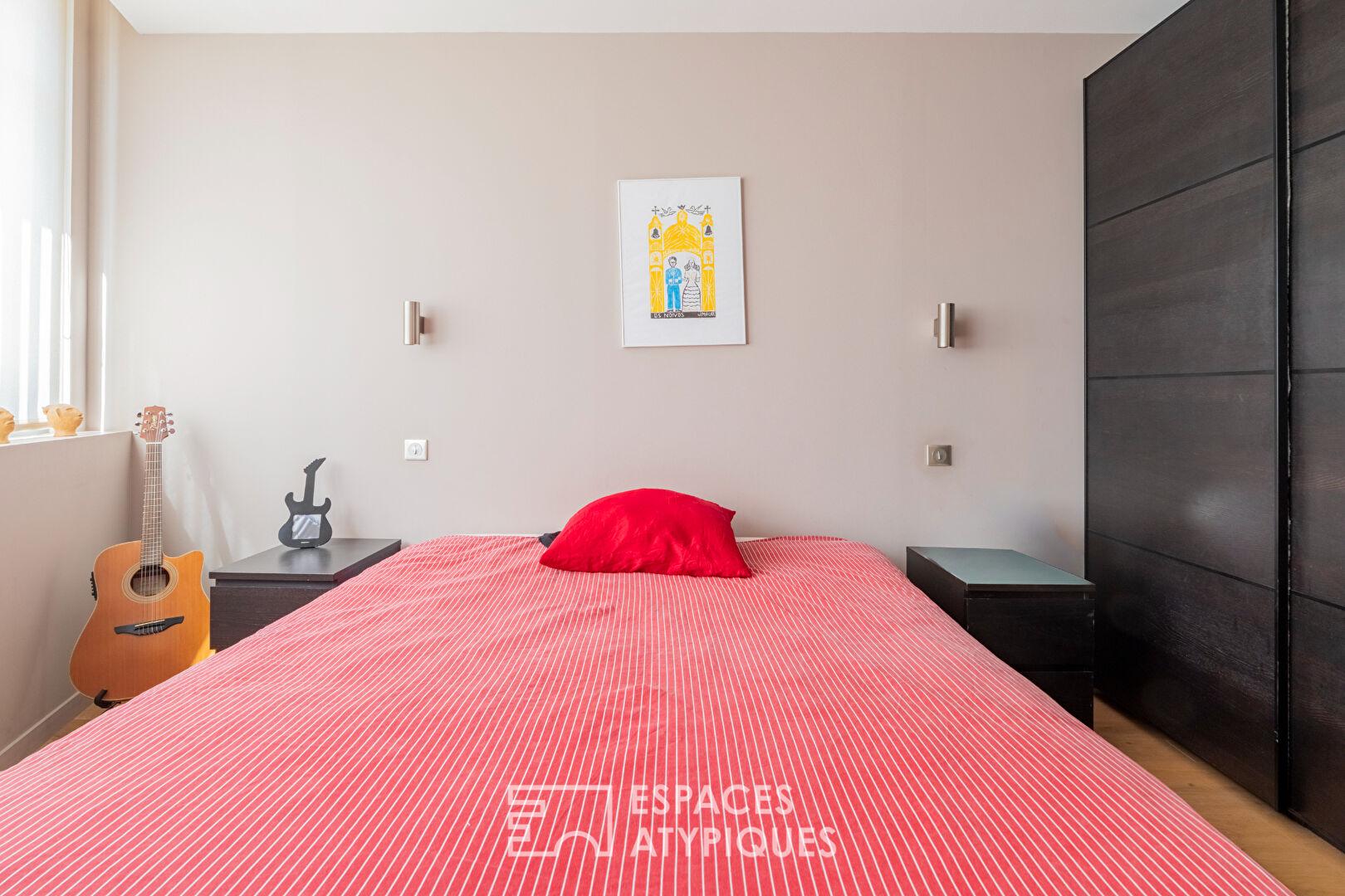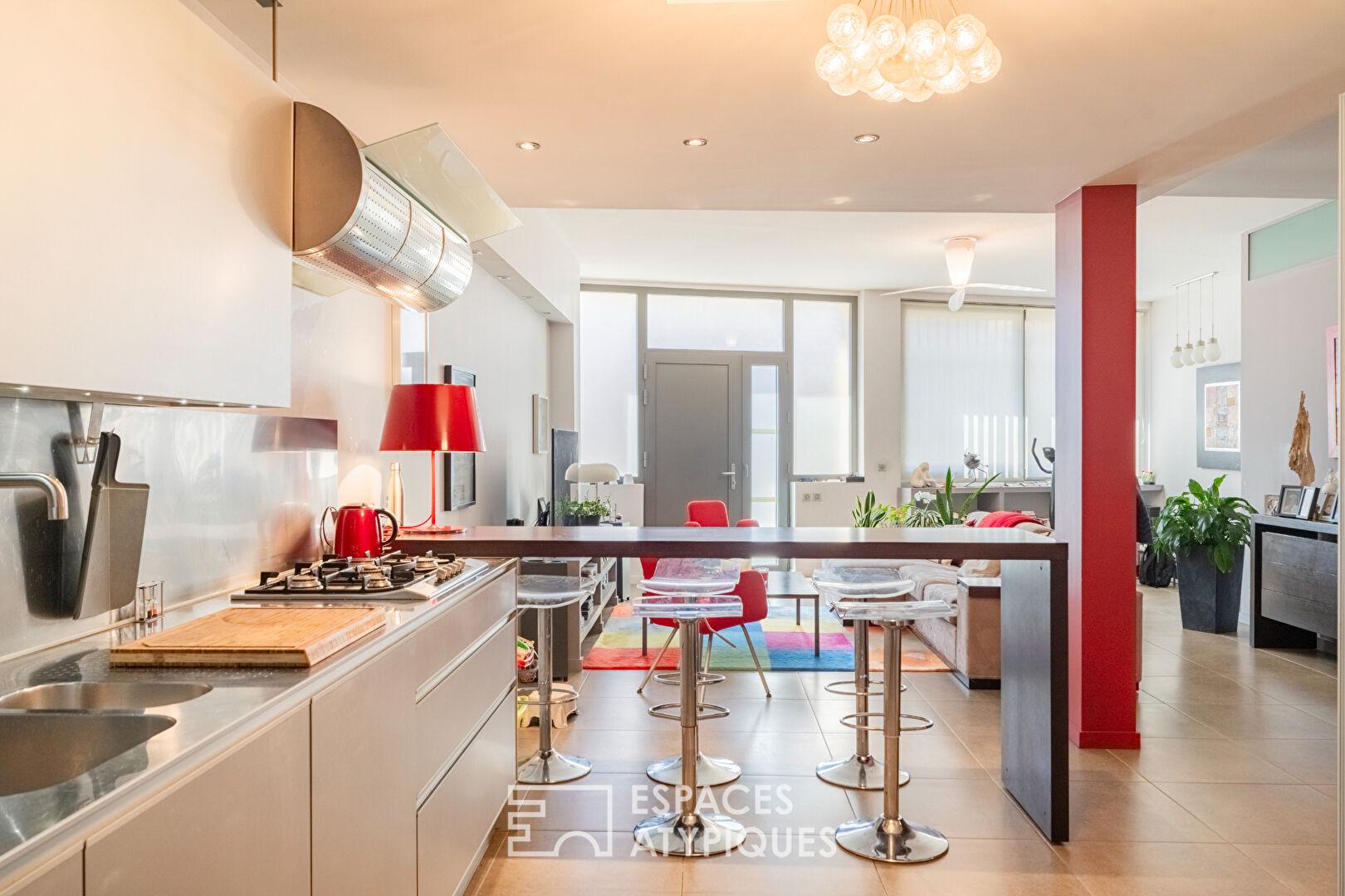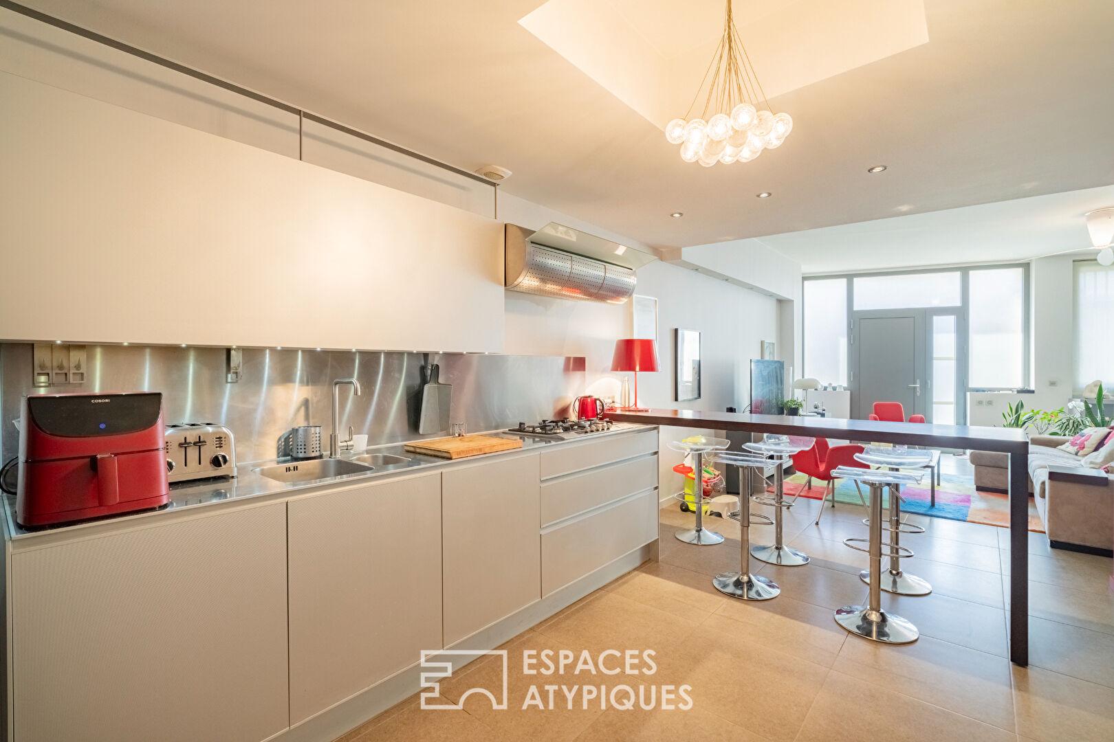 Dès l’entrée, les volumes et la distribution fluide dessinent un espace de vie harmonieux. La pièce principale de 60 m² s’organise autour d’un séjour confortable et d’une grande cuisine équipée avec matériaux haut de gamme pour le quotidien convivial. L’ensemble révèle une atmosphère douce, propice à une vie citadine apaisée. Un cellier et buanderie complète la première partie.