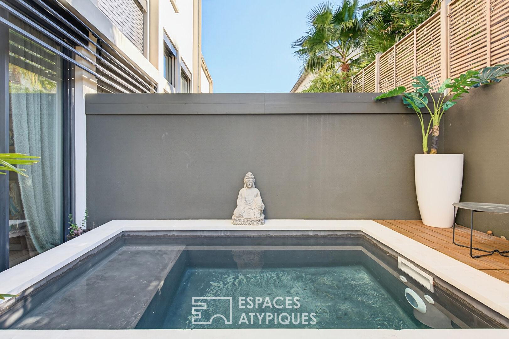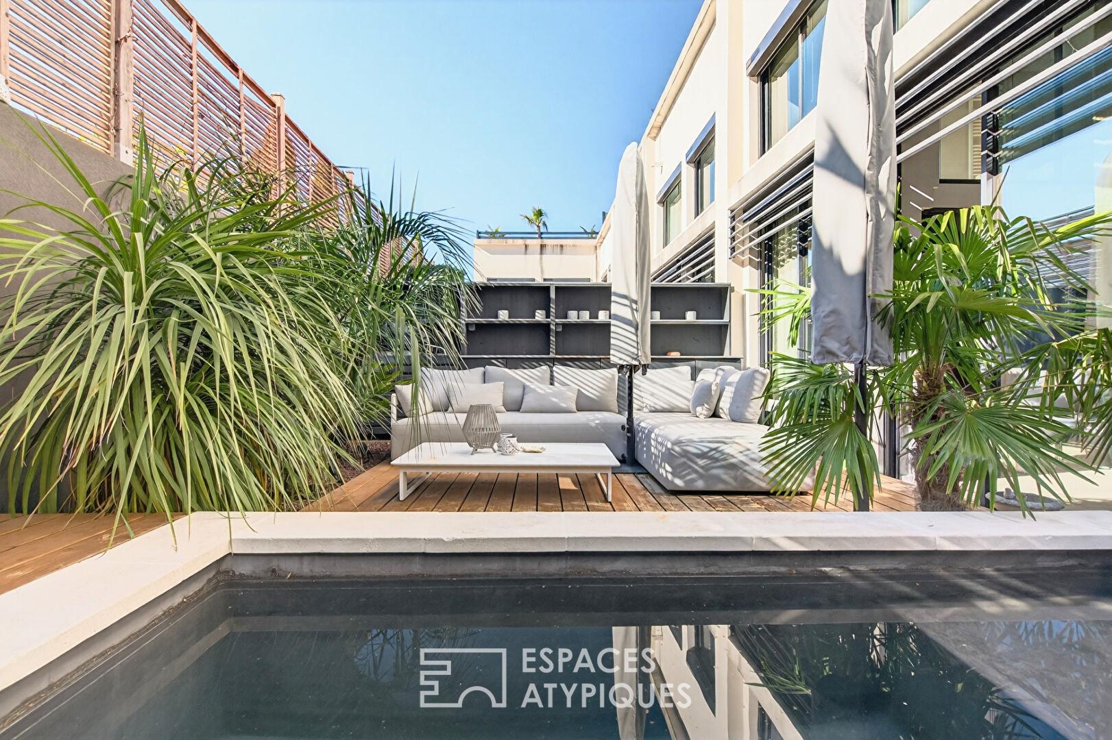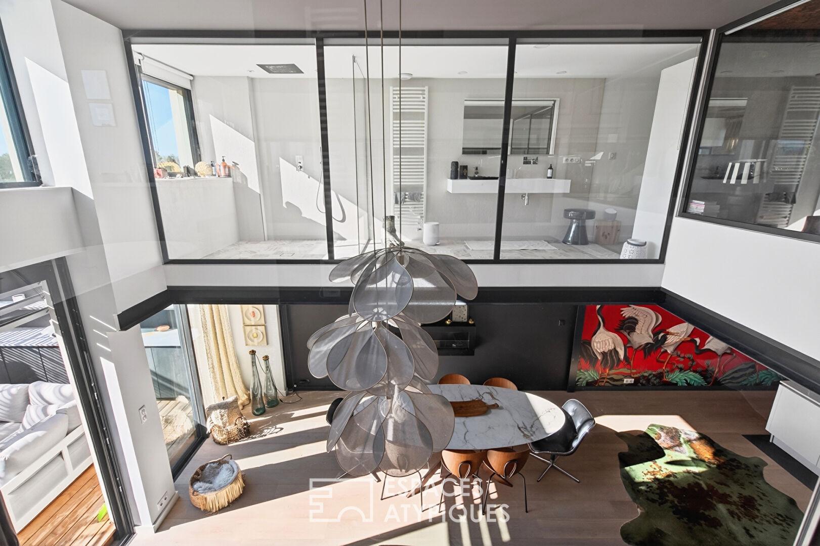 Une terrasse végétalisée de 37 m² prolonge le loft à l’extérieur, un bassin parfait ce havre de sérénité.