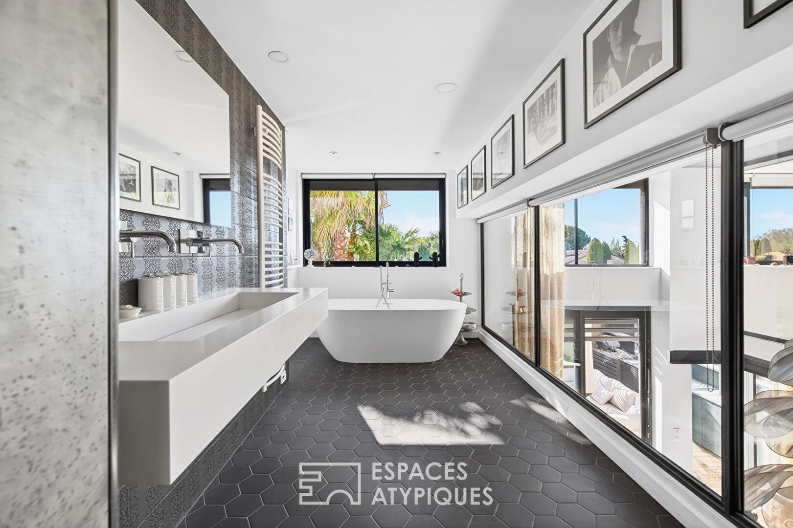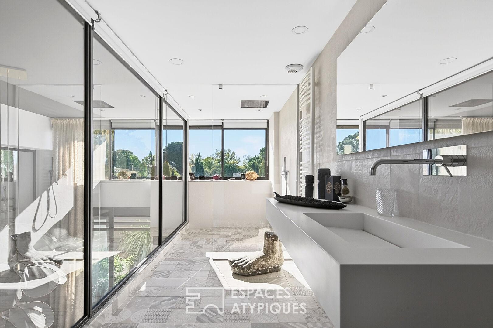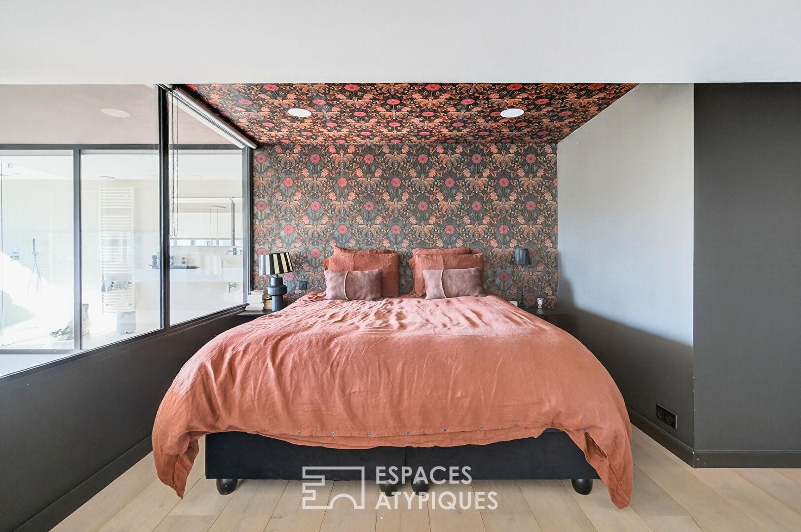 Une terrasse végétalisée de 37 m² prolonge le loft à l’extérieur, un bassin parfait ce havre de sérénité.