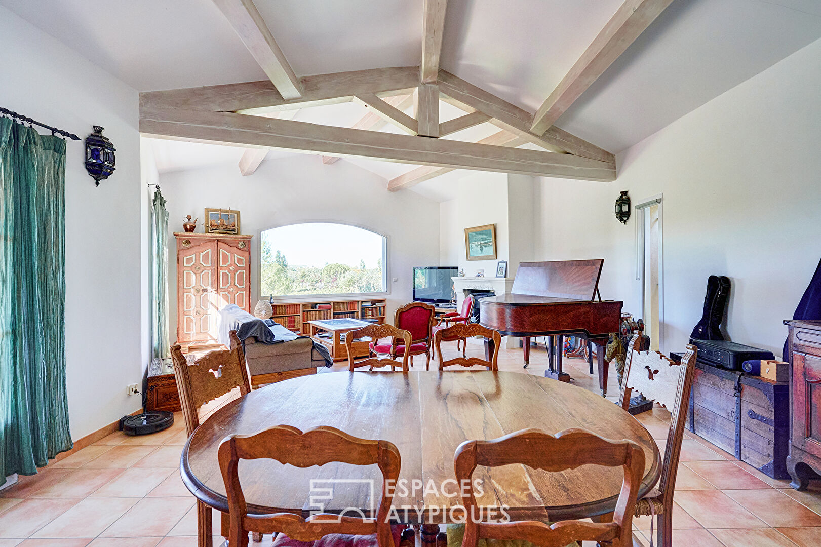 Les marqueurs vernaculaires tels que la charpente en bois massif, le sol en terre cuite et les différentes ouvertures sur les cyprès et oliviers du parc paysager définissent le caractère résolument provençal de cette habitation.