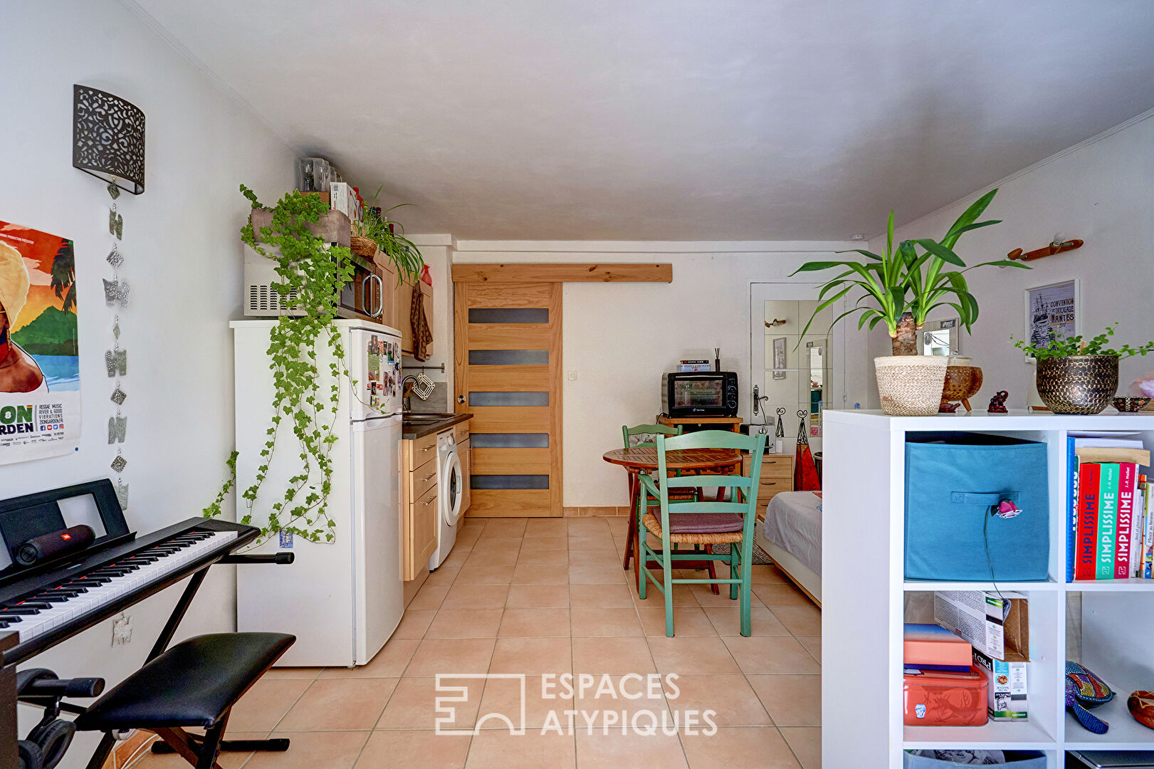 L’entrée mène à un vaste espace de vie illuminé par une grande baie vitrée qui offre, tel un tableau vivant, une vue dégagée sur le cadre naturel de la propriété. Une suite parentale complète ce niveau. L’étage qui bénéficie d’une entrée indépendante se compose d’un salon avec cuisine, prolongé par une terrasse avec vue panoramique sur les vignes alentour, deux chambres et leur salle d’eau viennent terminer l’espace.