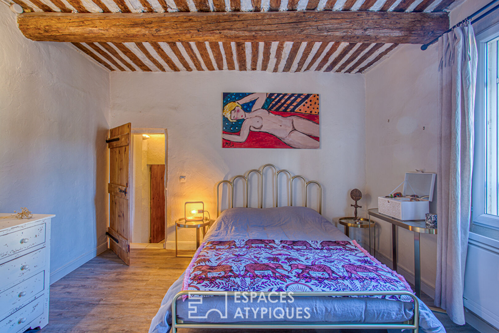 Le seuil franchi, l’espace de vie déploie en enfilade une gracieuse cuisine dînatoire avec son plan de travail en béton ciré et son évier de ferme ancien, une spacieuse salle à manger, réchauffée l’hiver par son poêle à bois et un vaste salon, lumineux grâce à un puits de lumière et une baie vitrée qui s’ouvre sur un escalier menant à la terrasse puis au jardin en restanques.