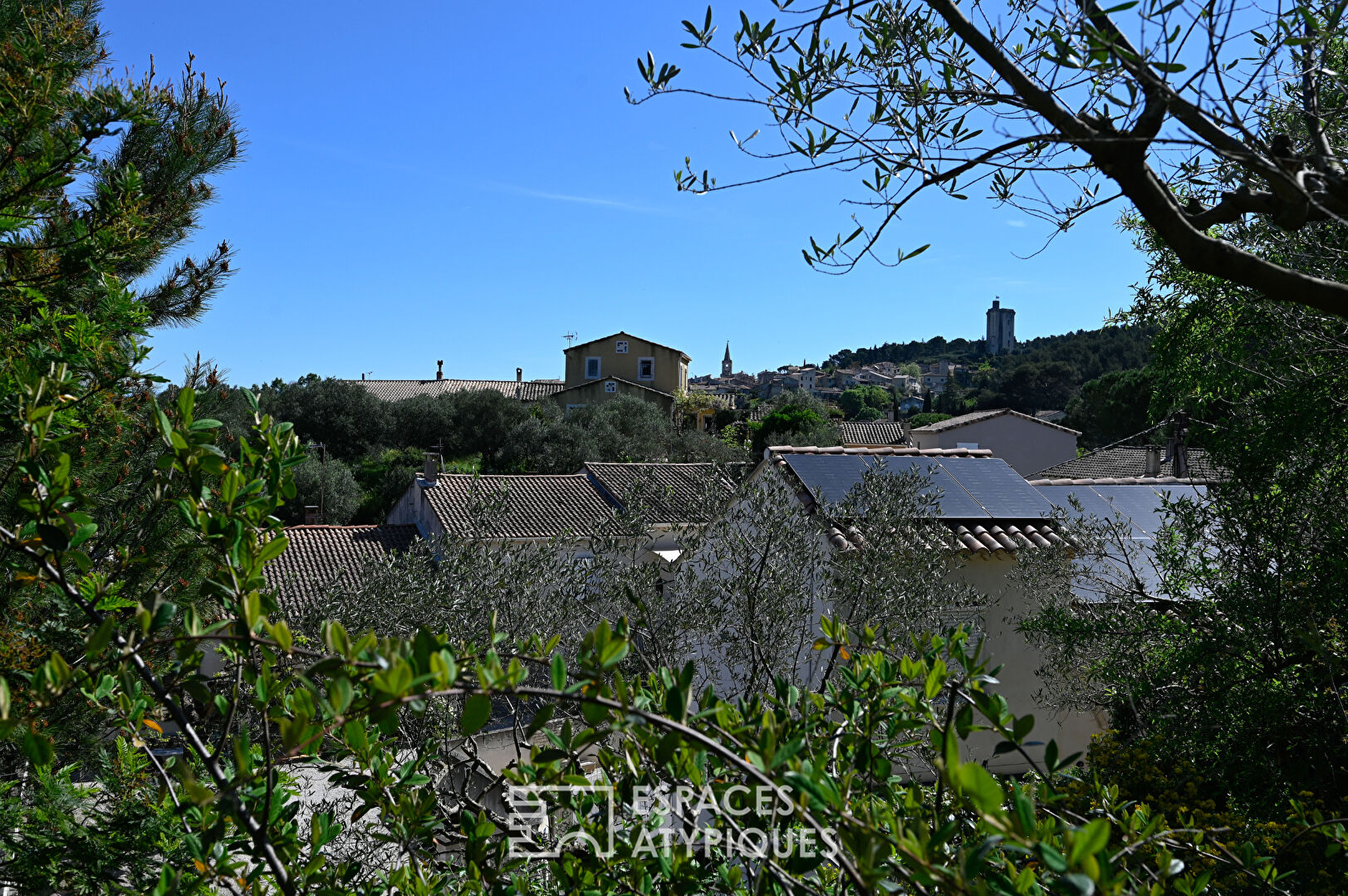 A 8 minutes de la gare TGV, cette jolie maison aux volets bleus se blottit au pied de la Montagnette, dans une paisible impasse du village pittoresque et animé de Barbentane.