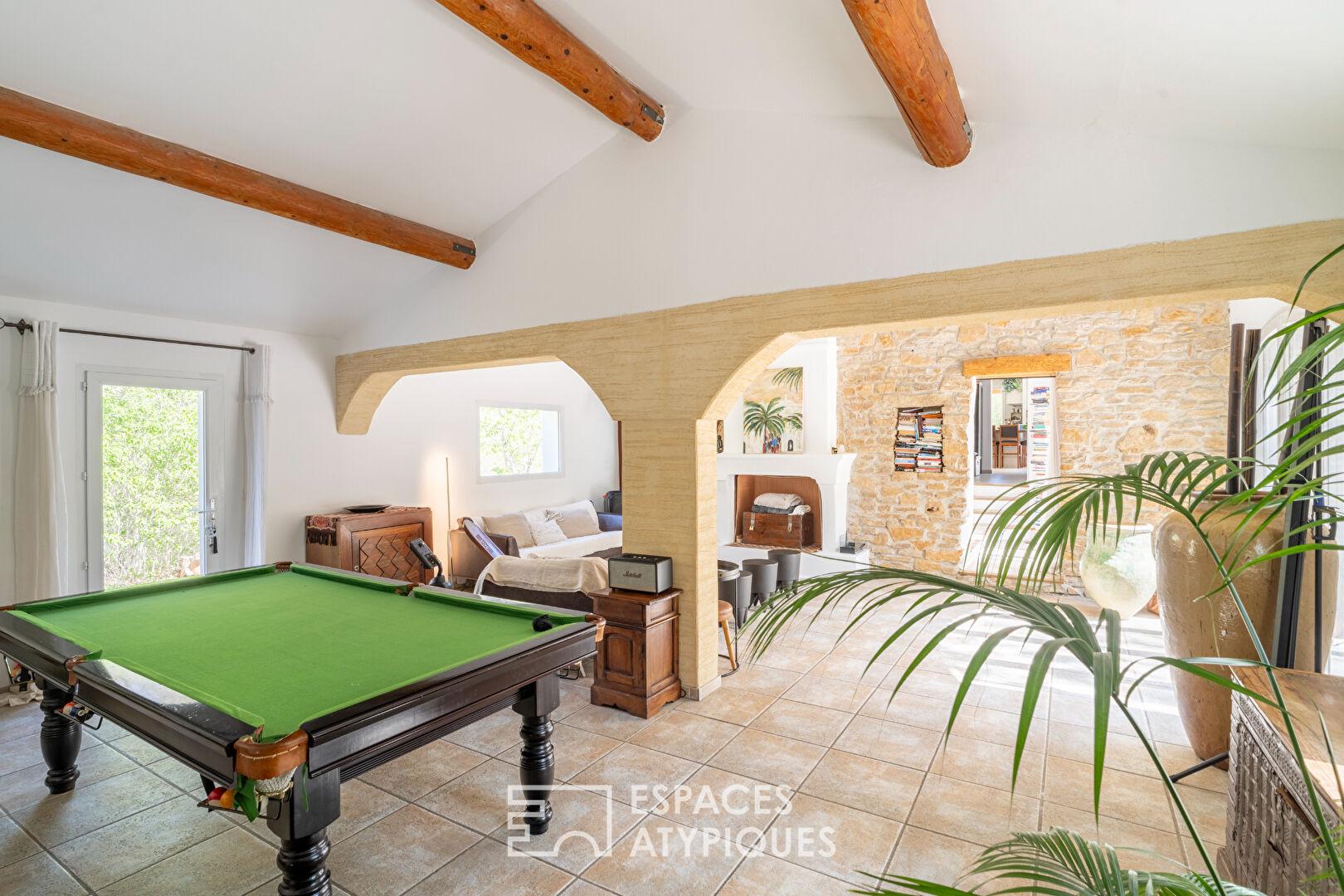 Entièrement rénovée avec exigence, la propriété a été repensée dans un subtil équilibre entre confort contemporain en respectant son âme originelle. Dès l’entrée, le regard est attiré par la générosité des volumes du double séjour. Les pierres apparentes racontent l’histoire du lieu, tandis que la cheminée, pièce maîtresse, diffuse une chaleur enveloppante. De larges ouvertures effacent les frontières entre intérieur et extérieur et qui offre une immersion immédiate dans la végétation environnante.
