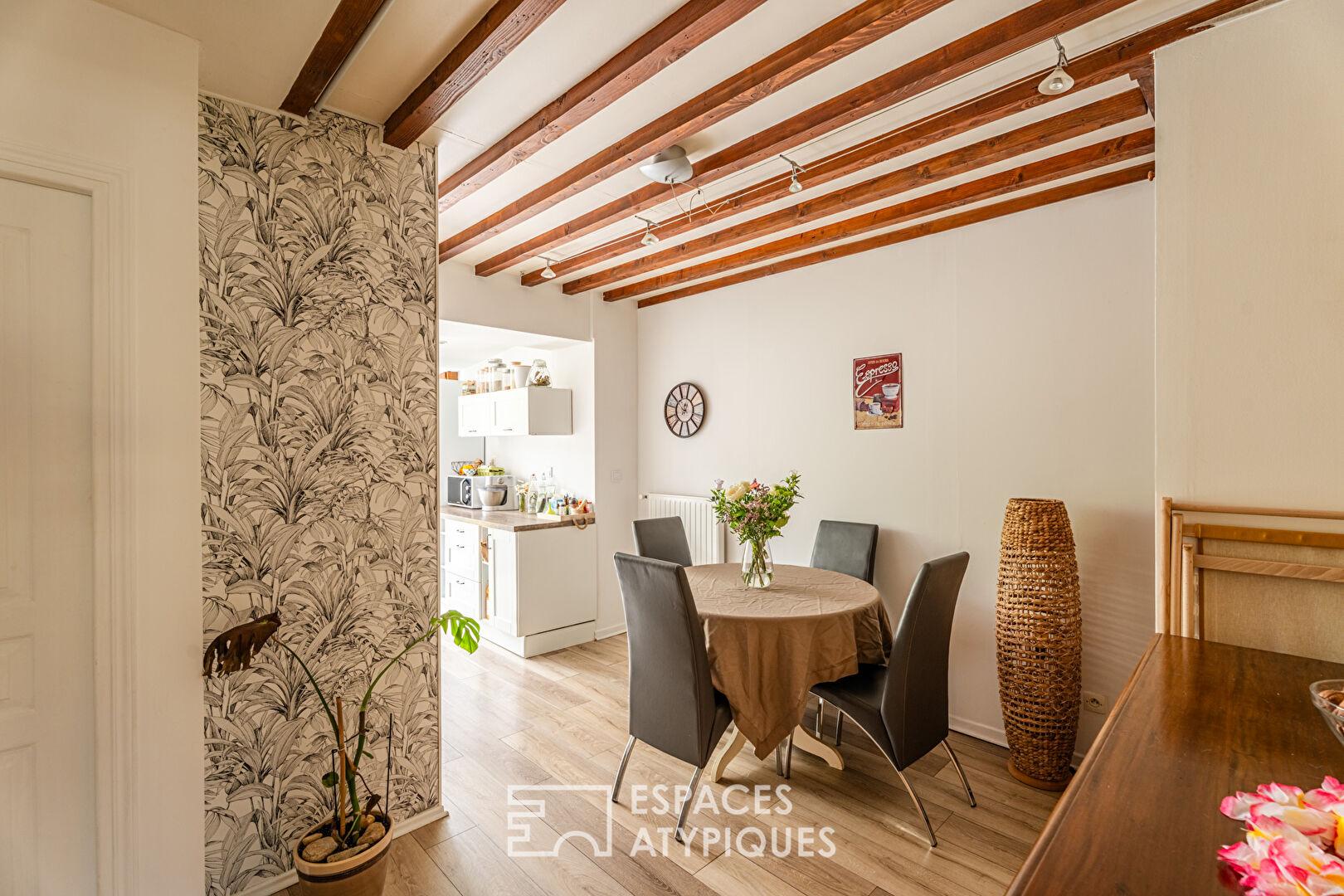 Dans le prolongement de cet espace, la salle à manger et la cuisine équipée jouxtent un jardin coquet propice à faire partager des moments conviviaux.