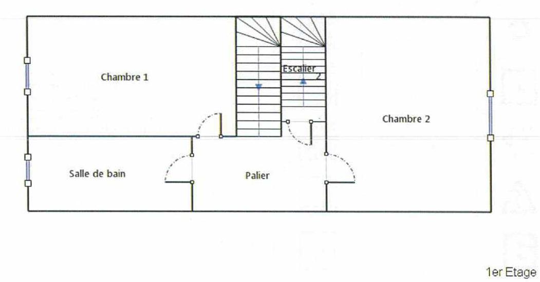 Au premier étage, les deux chambres de 10 m² et 13 m² cohabitent avec la salle de bains.