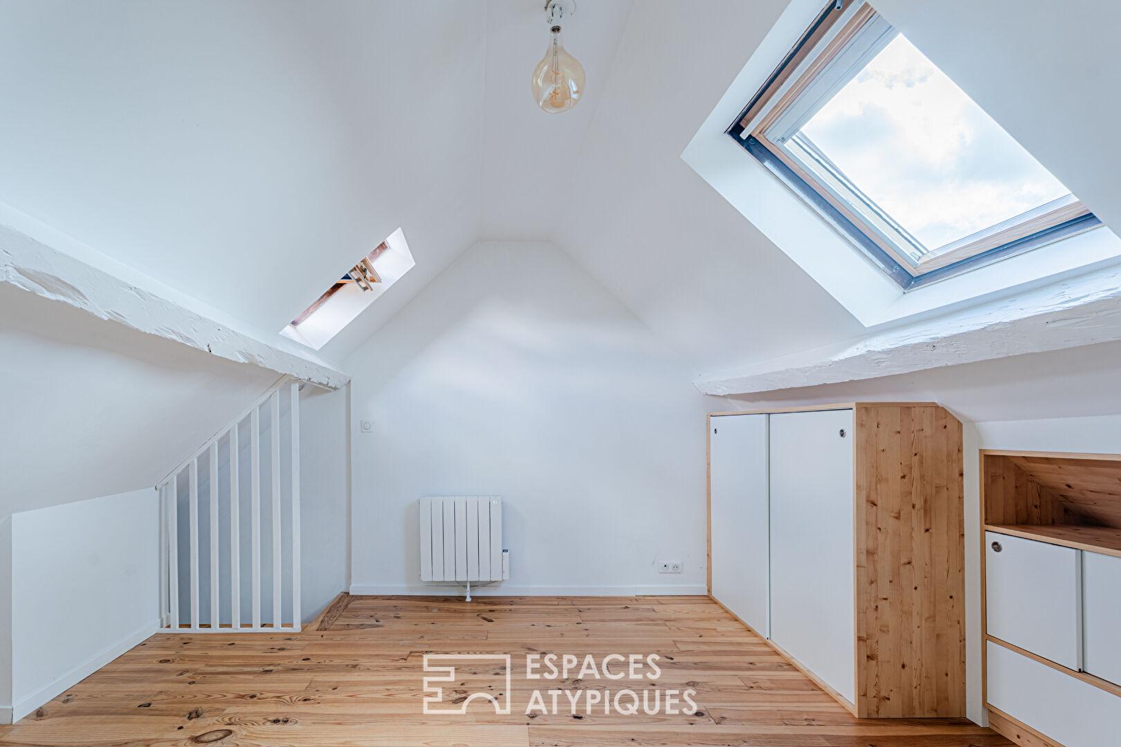 Sous les toits, le dernier niveau mansardé d’environ 18 m², optimisé par des rangements ingénieux, se module au gré des envies : chambre d’enfant(s), cocon cinéma ou bureau.