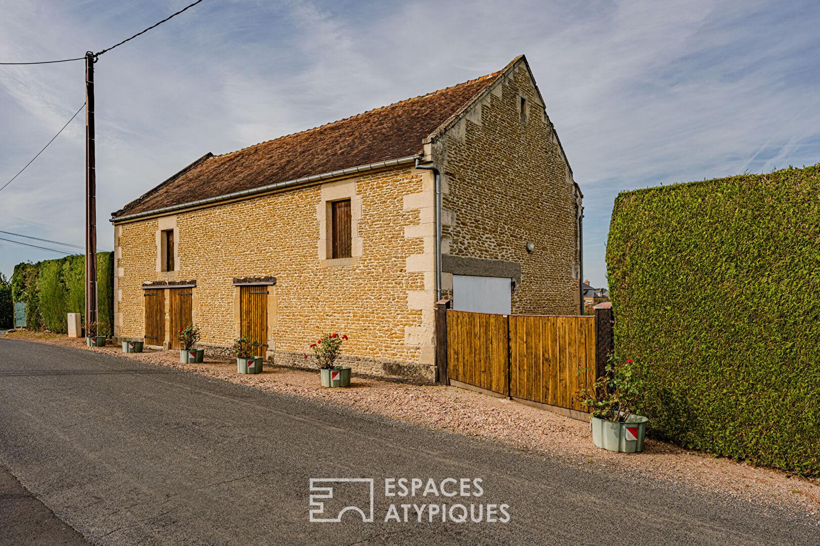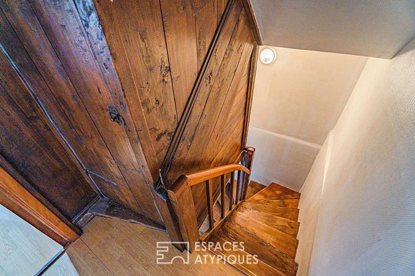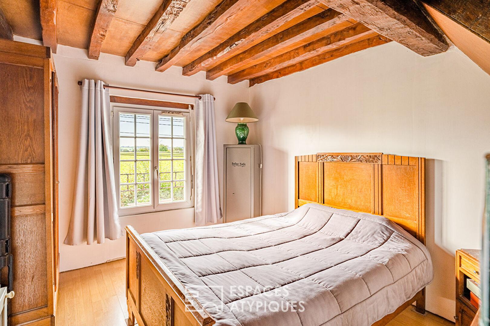 La maison principale en colombage et pierres de 66 m² vous accueil dans une ambiance chaleureuse et hors du temps avec ses matériaux anciens, tomettes, poutres et cheminée.