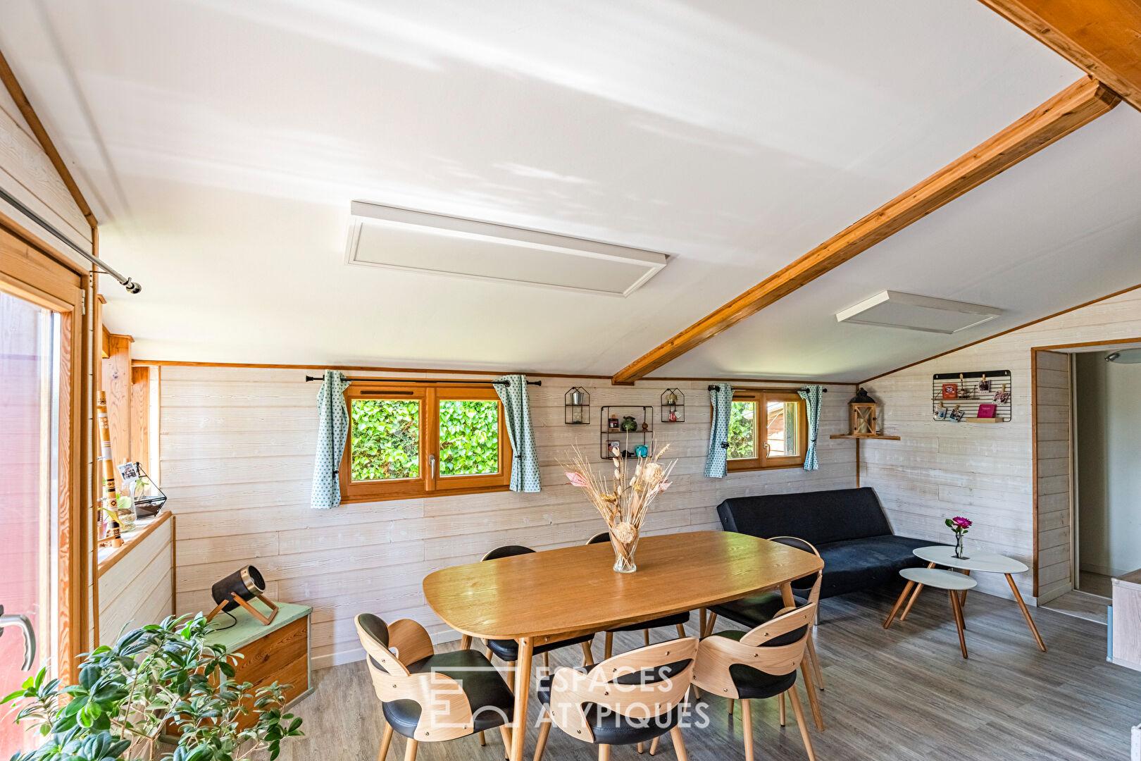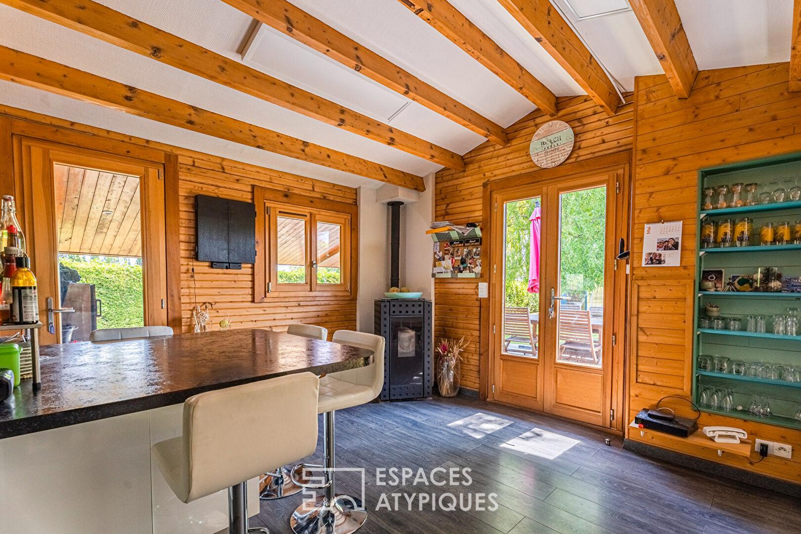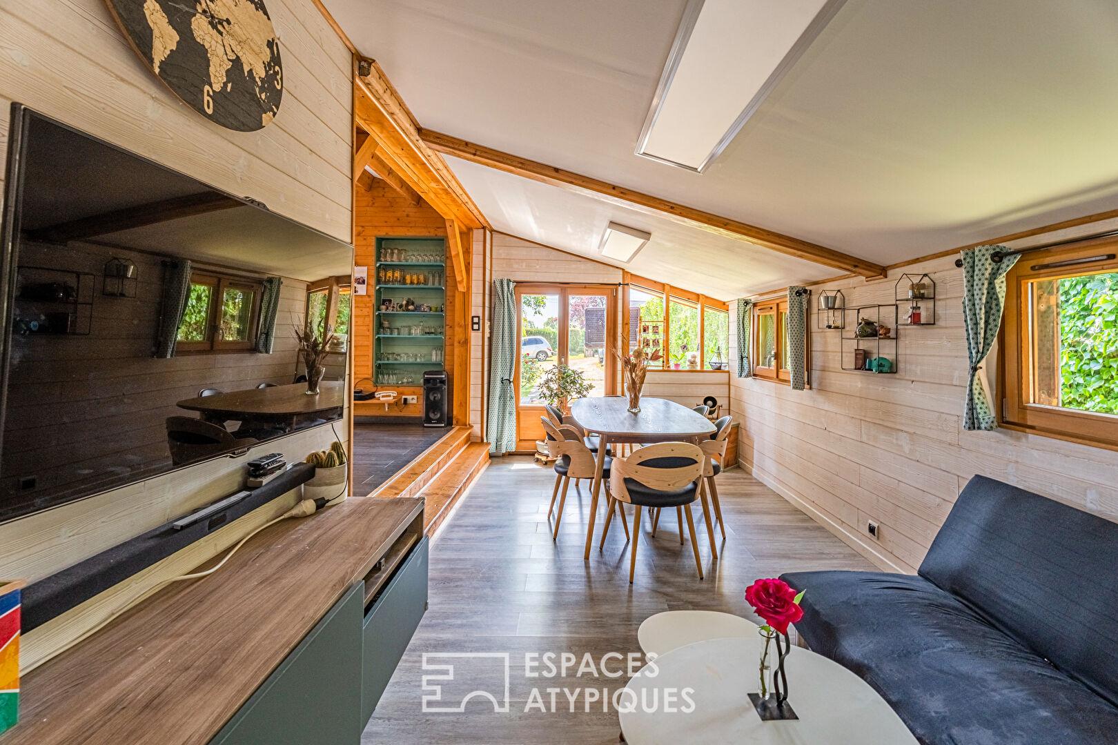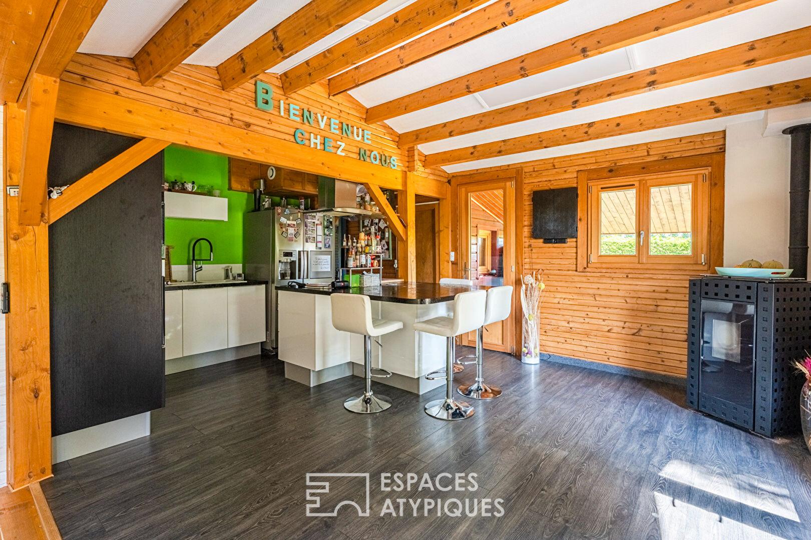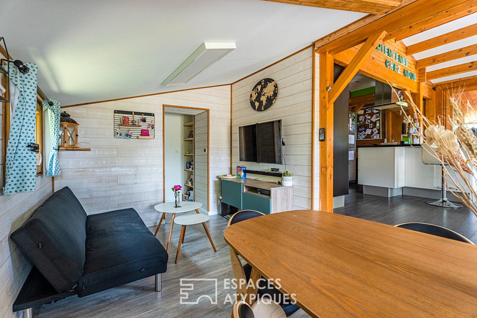 Situé à quelques minutes de la commune dynamique de Saint Pierre en Auge, ce charmant chalet de 83 m², de plain pied, hébergé sur une parcelle bucolique de 1040 m² env. est un réel havre de paix.
