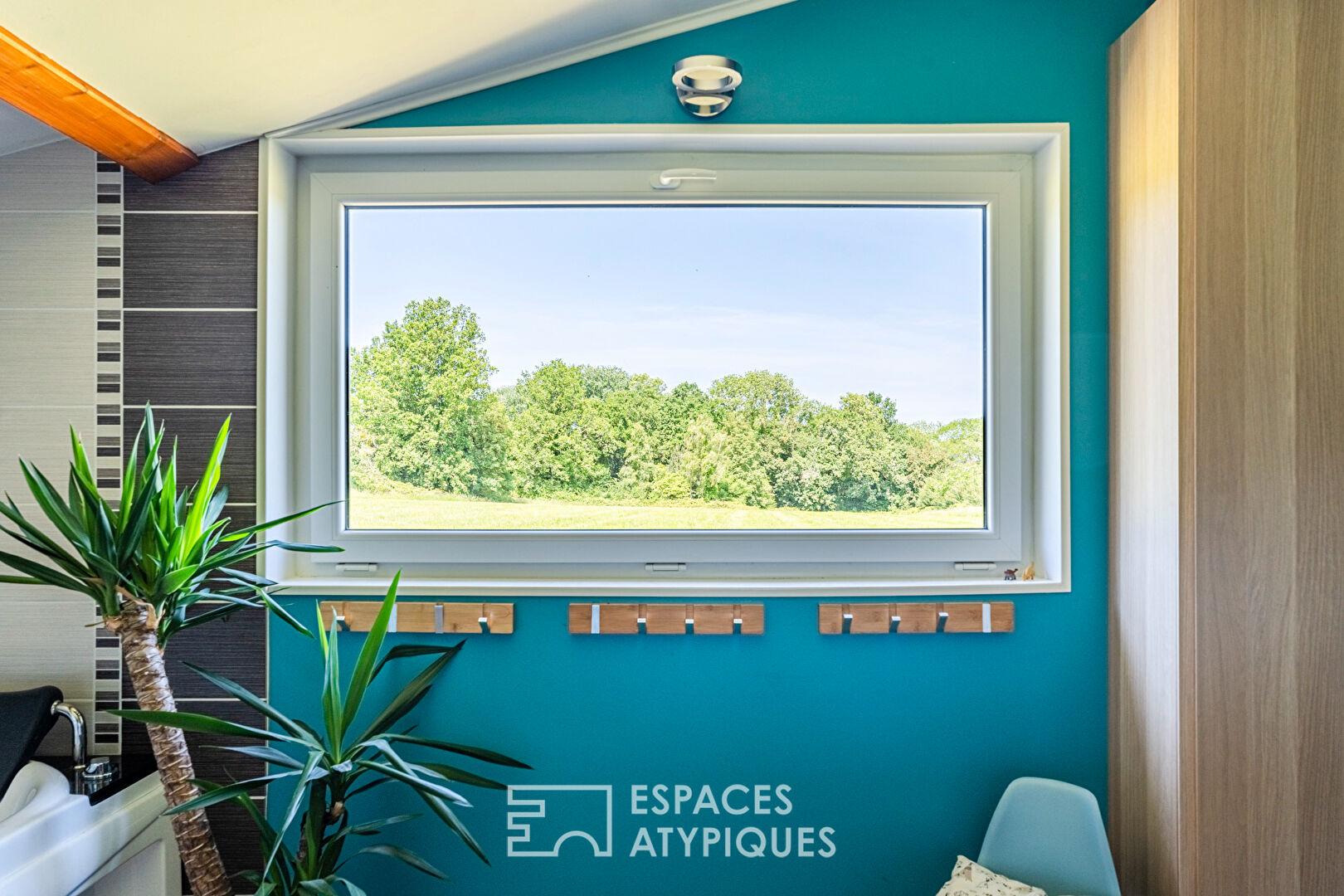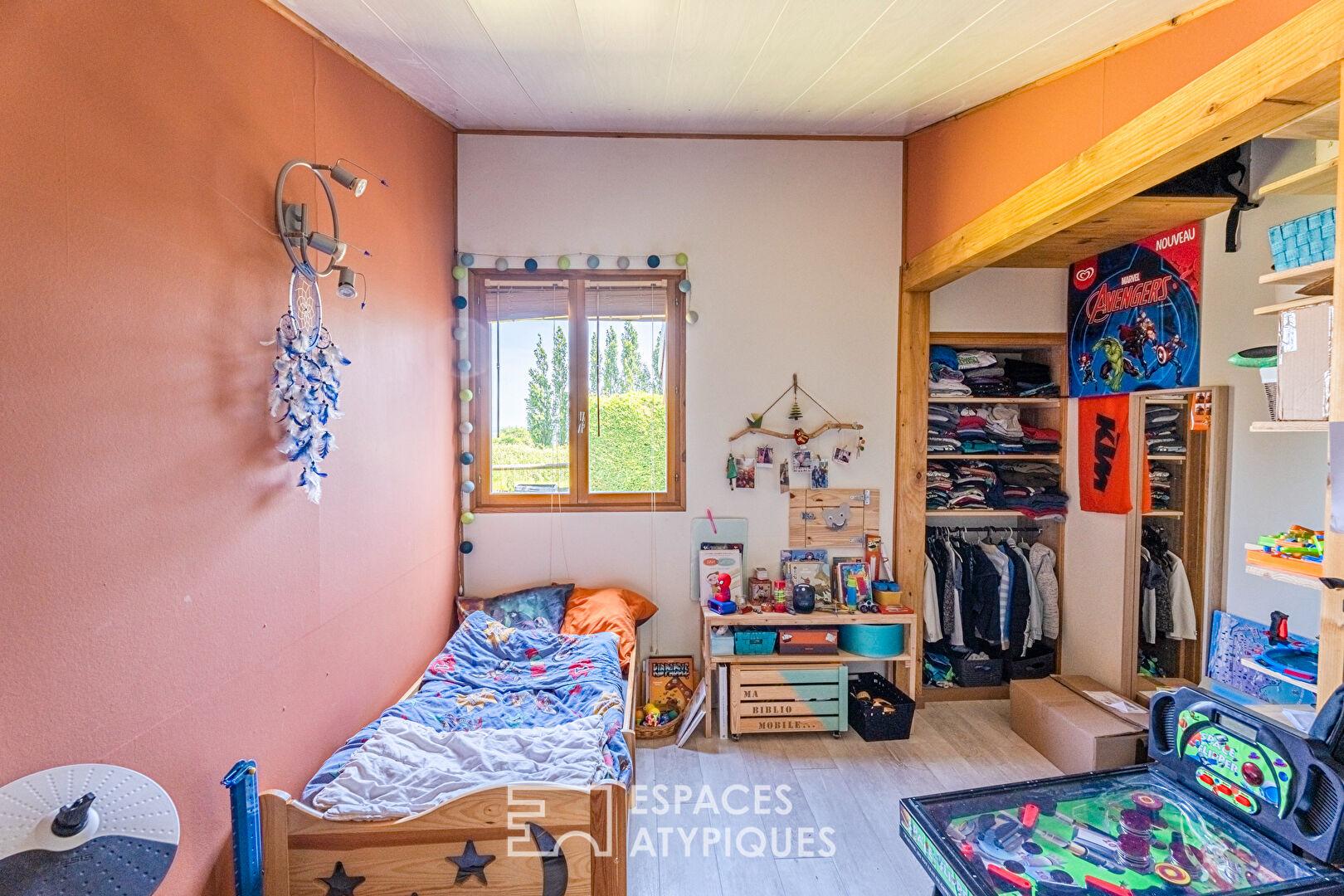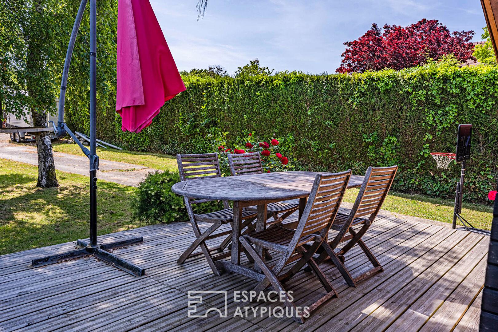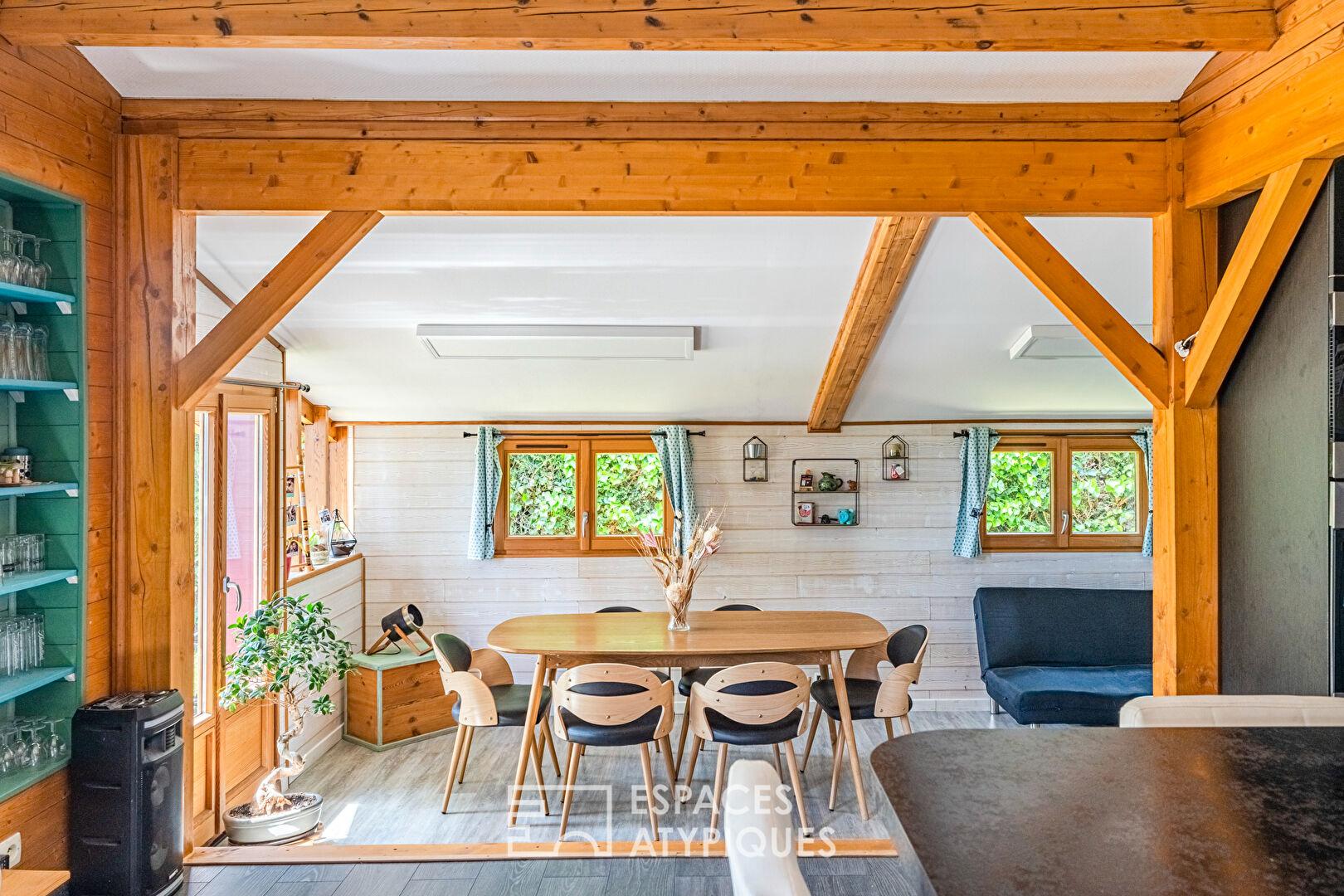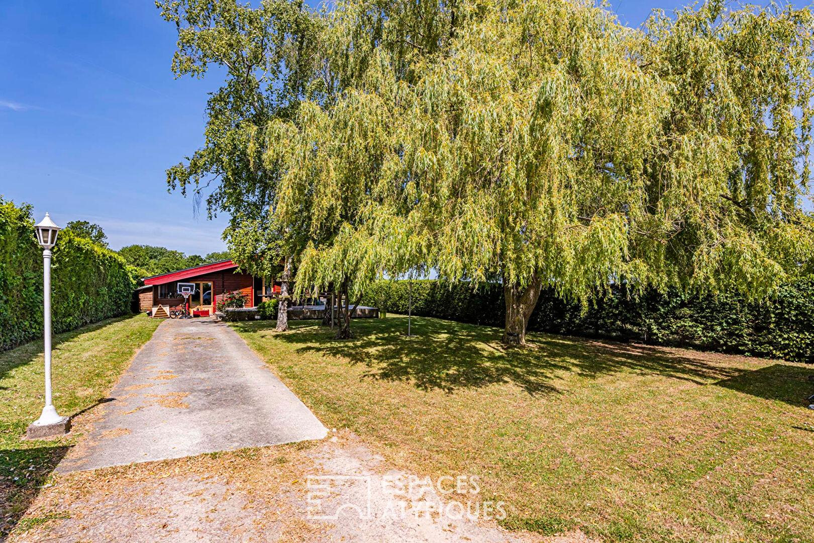 Situé à quelques minutes de la commune dynamique de Saint Pierre en Auge, ce charmant chalet de 83 m², de plain pied, hébergé sur une parcelle bucolique de 1040 m² env. est un réel havre de paix.