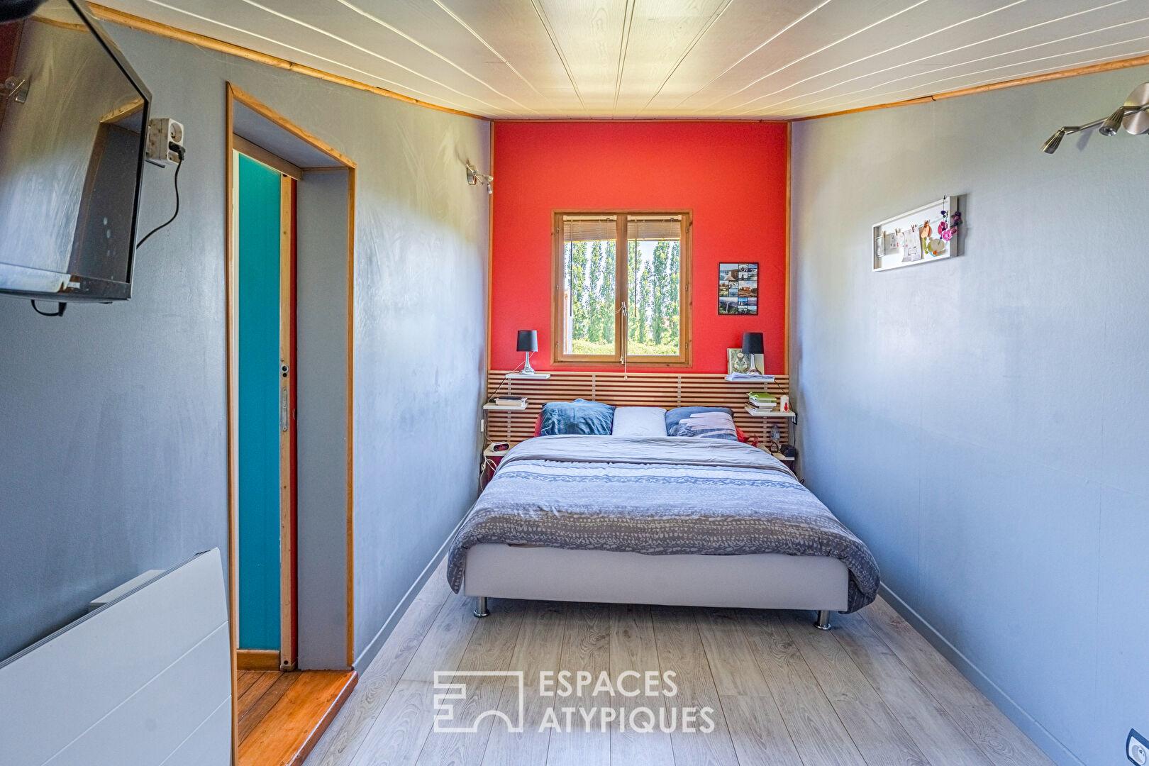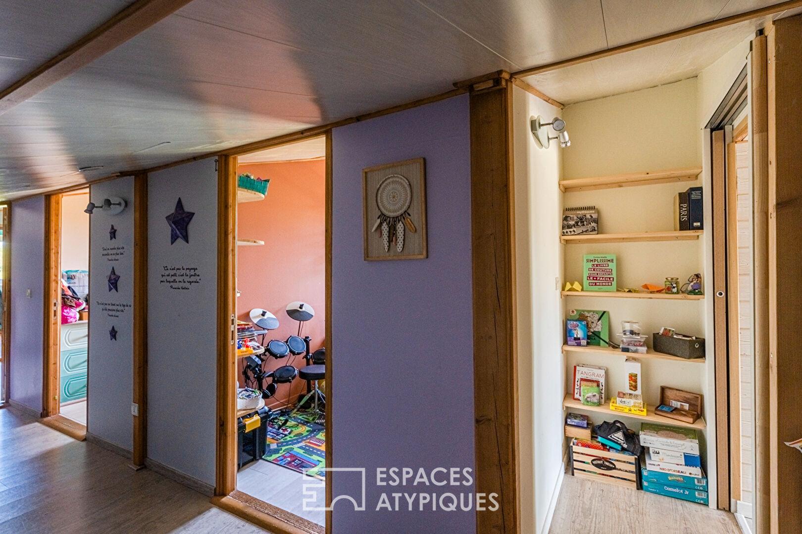L’entrée ouvre sur une pièce de vie d’environ 37 m² incluant un espace cuisine dinatoire, ouvert sur la terrasse en bois, attenante à la salle à manger et au salon très cocooning. Cette partie de la maison bénéficie également d’une salle d’eau ainsi que d’un cellier faisant office de garde-manger / buanderie.