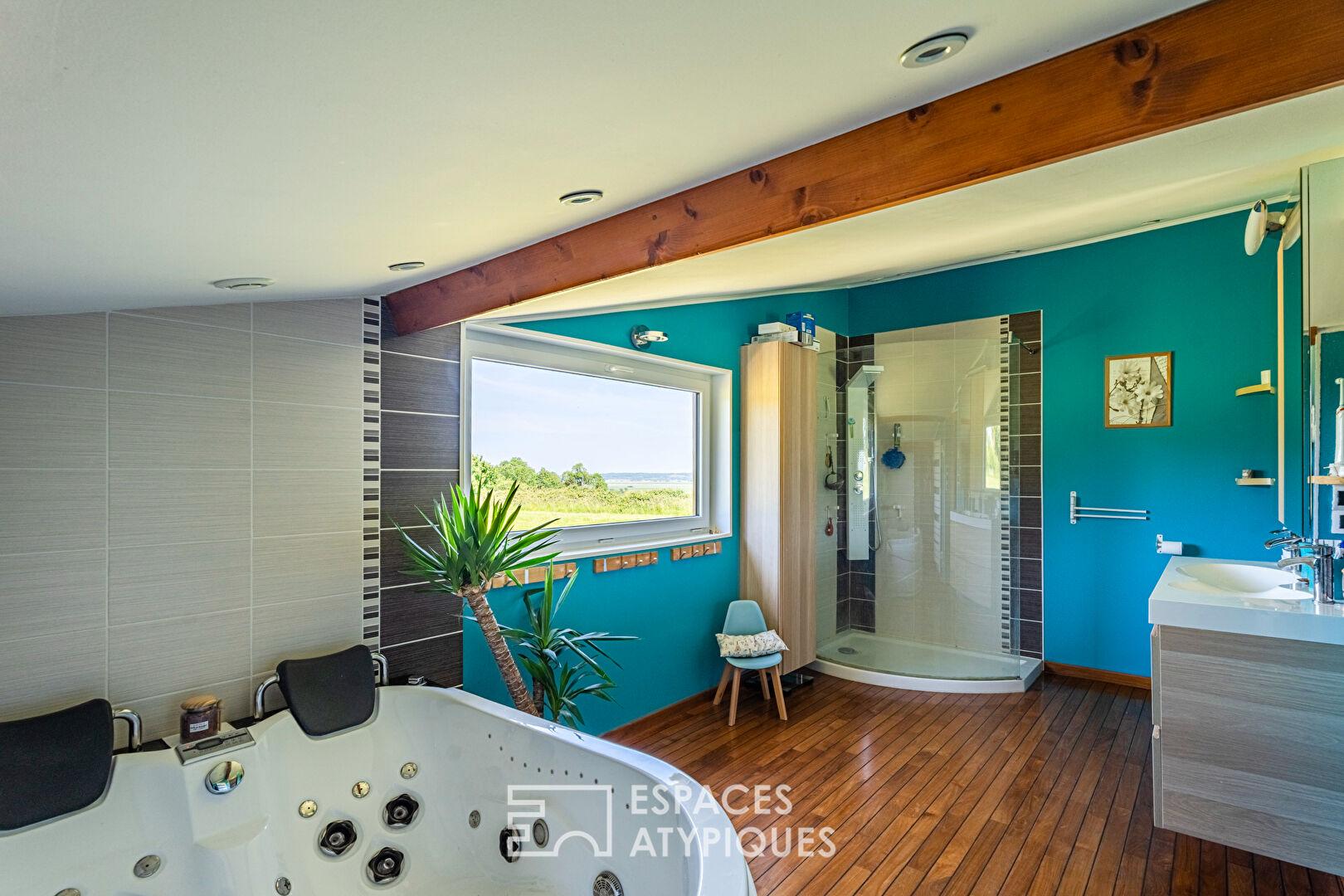 Un long couloir dessert l’espace nuit composé de trois chambres ainsi qu’une ravissante salle de bain jouissant d’une vue dégagée sur la campagne environnante, avec baignoire balnéo et douche italienne.