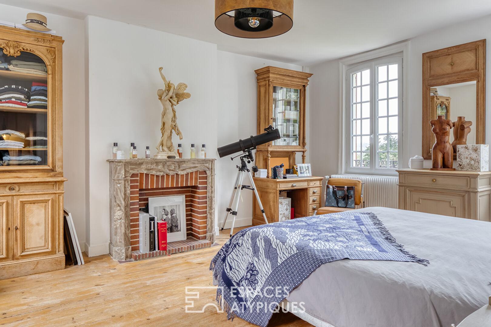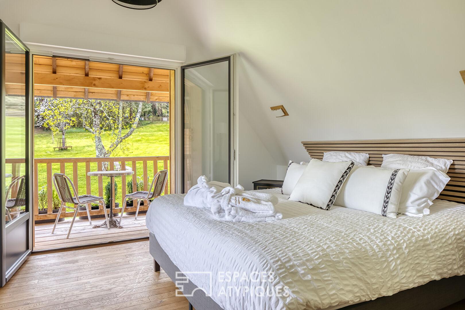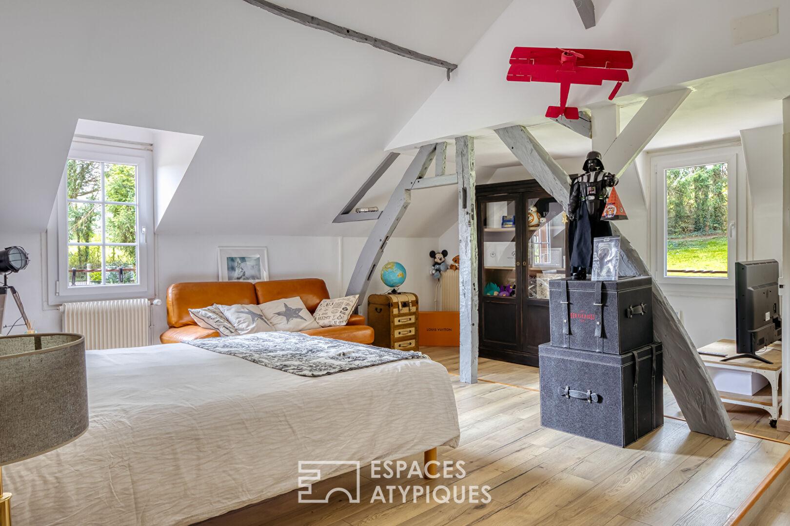 La demeure principale séduit par ses volumes et sa distribution sur plusieurs niveaux. Le rez-de-chaussée accueille une cuisine semi-professionnelle avec cellier, une salle à manger chaleureuse avec insert, un salon avec cheminée et un bureau. L’espace nuit se déploie sur trois niveaux : une chambre en rez-de-chaussée, deux chambres au premier étage, une suite et une salle de bains. Au second, sous mansardes, se trouve une suite. L’agencement intérieur joue sur la verticalité et le cachet des matériaux anciens.