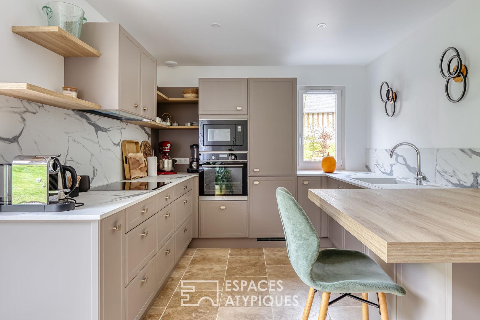 À l’extérieur, les terrasses et le parc offrent un cadre bucolique préservé des regards, à proximité immédiate des commerces et des plages de la Côte Fleurie.