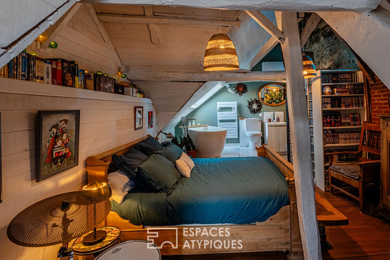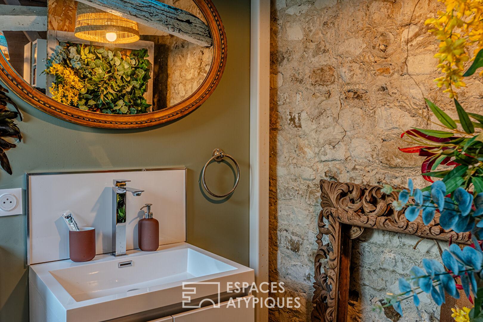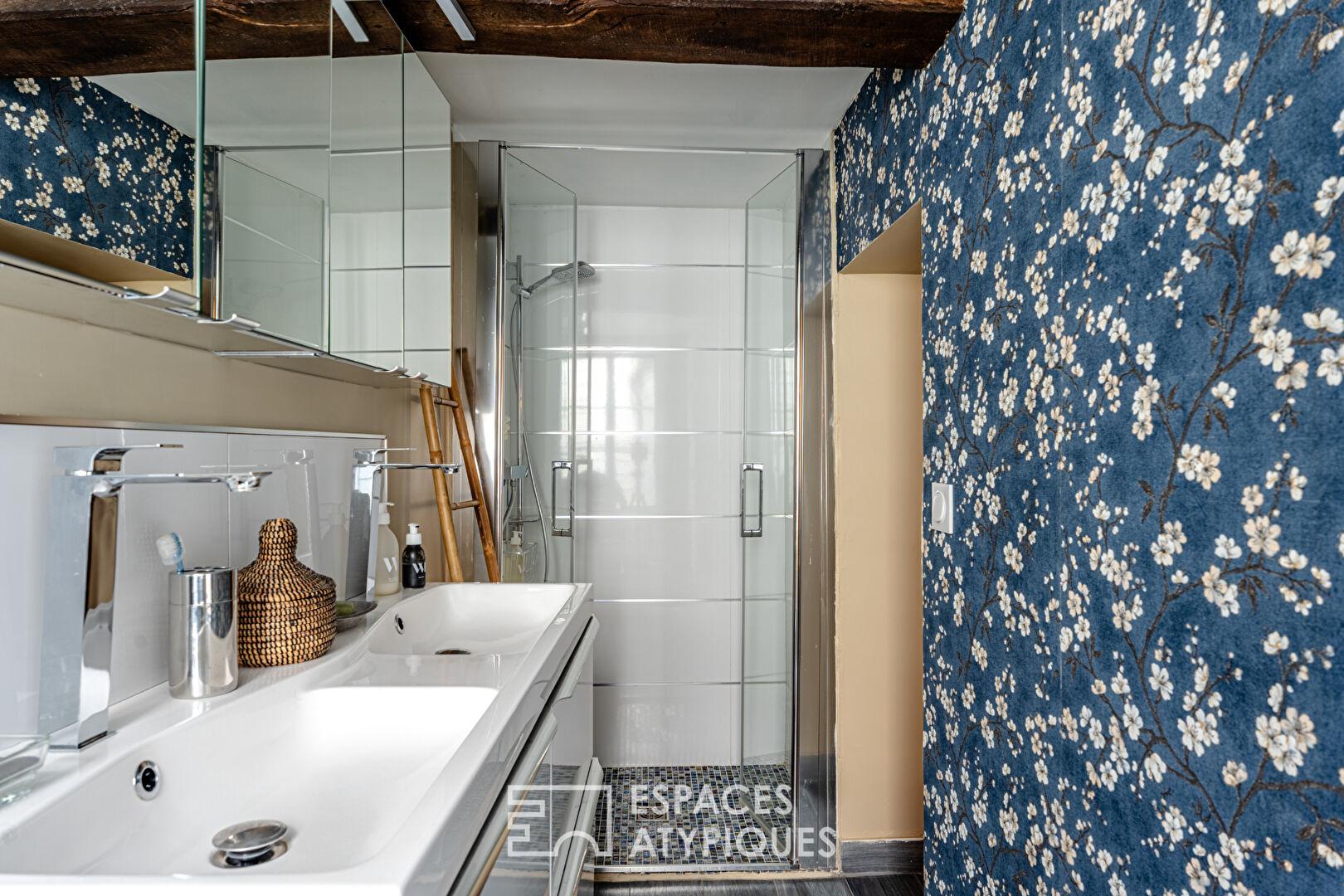 Cette maison récemment rénovée de 102 m² , 116 m² au sol , aménagée sur trois niveaux ,offre une configuration originale et un aménagement intérieur chaleureux et chargé d’histoire .