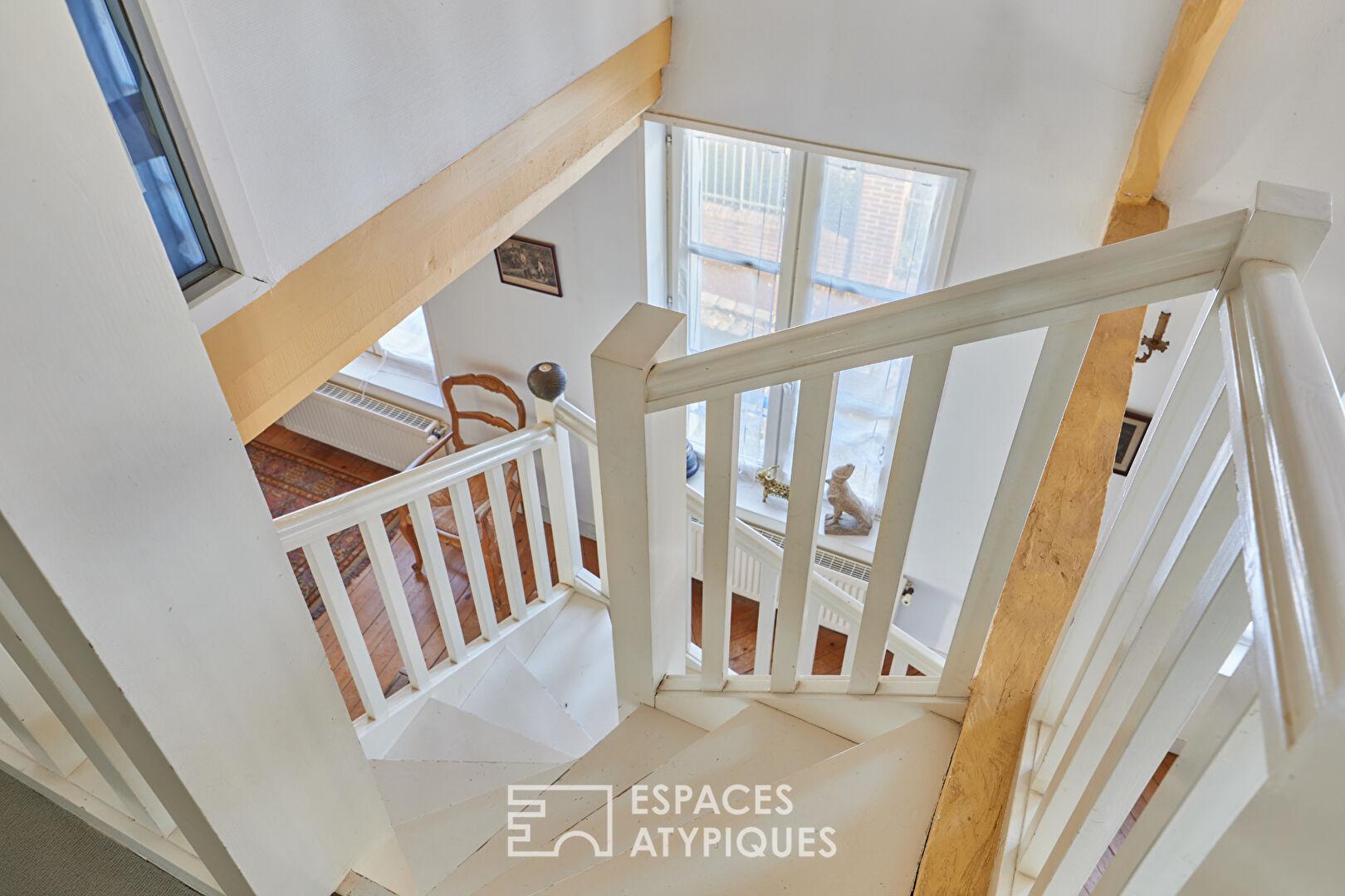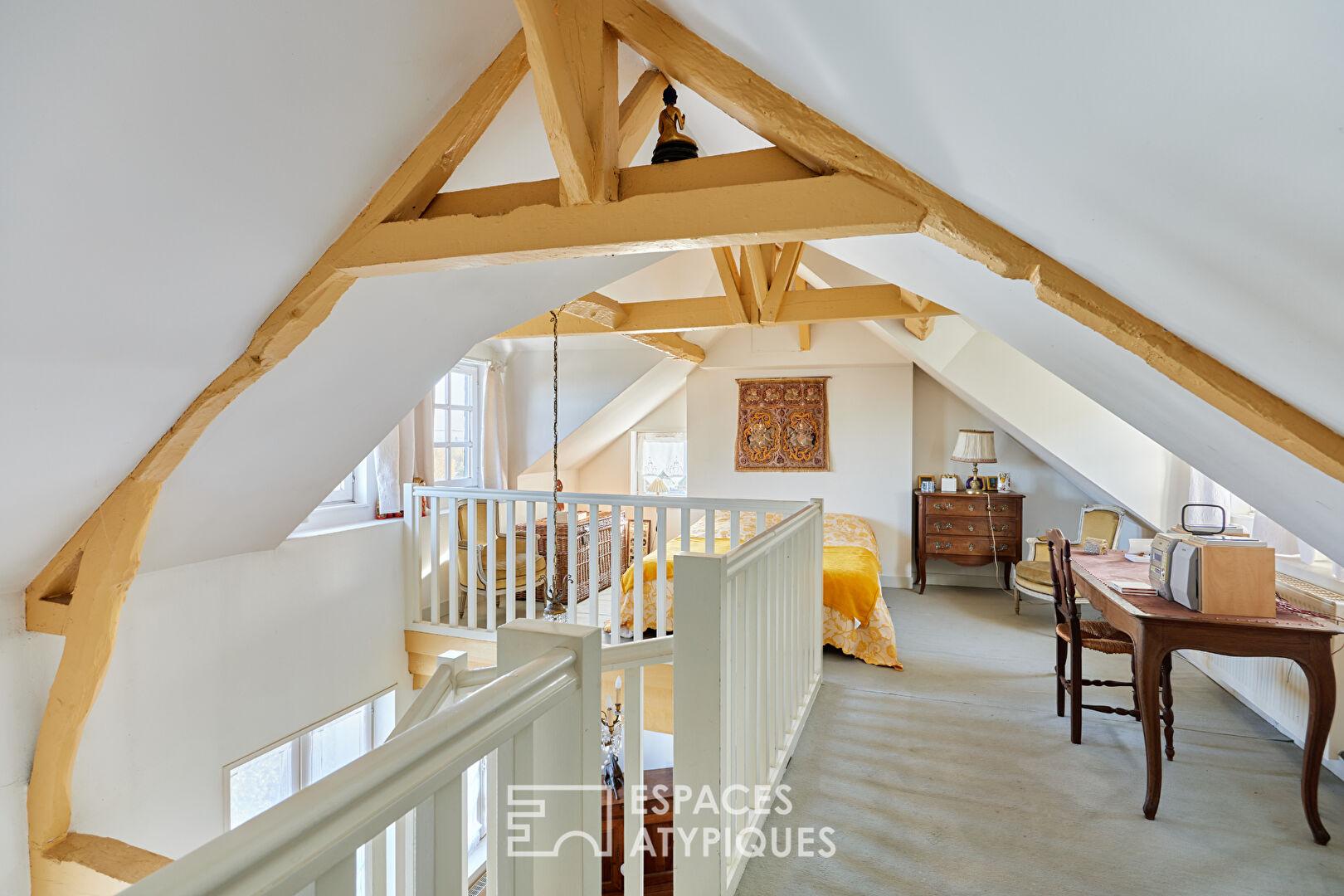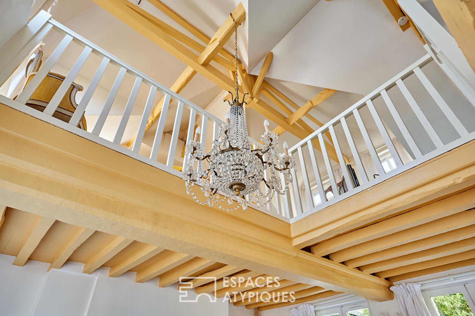 L’intérieur dévoile des volumes généreux, avec notamment un séjour cathédrale baigné de lumière. Dans cet espace, une majestueuse cheminée en marbre côtoie des poutres apparentes et un parquet d’origine, créant une ambiance chaleureuse et raffinée. Une splendide mezzanine surplombe cet espace, offrant une perspective unique et un lieu idéal pour un bureau ou un espace nuit supplémentaire. La circulation entre les niveaux s’effectue par de jolis escaliers en colimaçon.