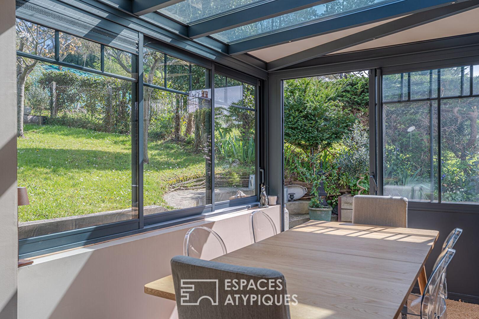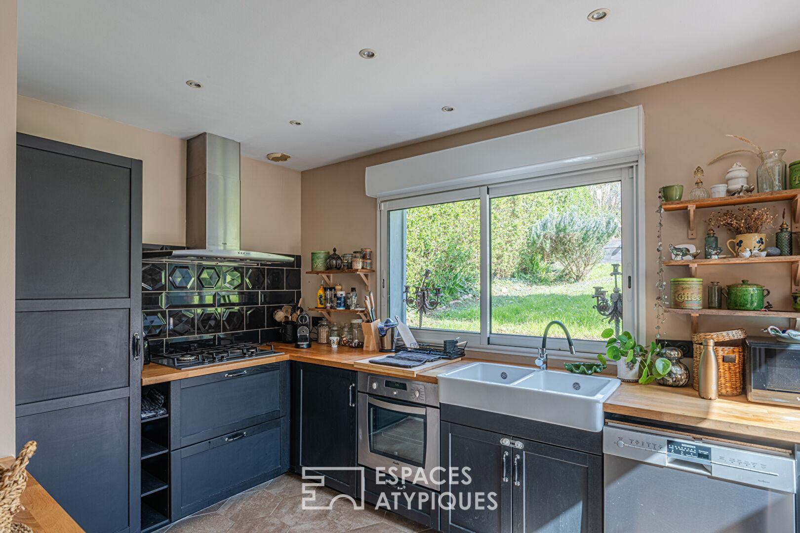 Le rez-de-chaussée est pensé pour les moments de partage. Le séjour avec sa cuisine ouverte et une agréable véranda s’ouvrent sur le jardin, promesse d’une lumière naturelle omniprésente.