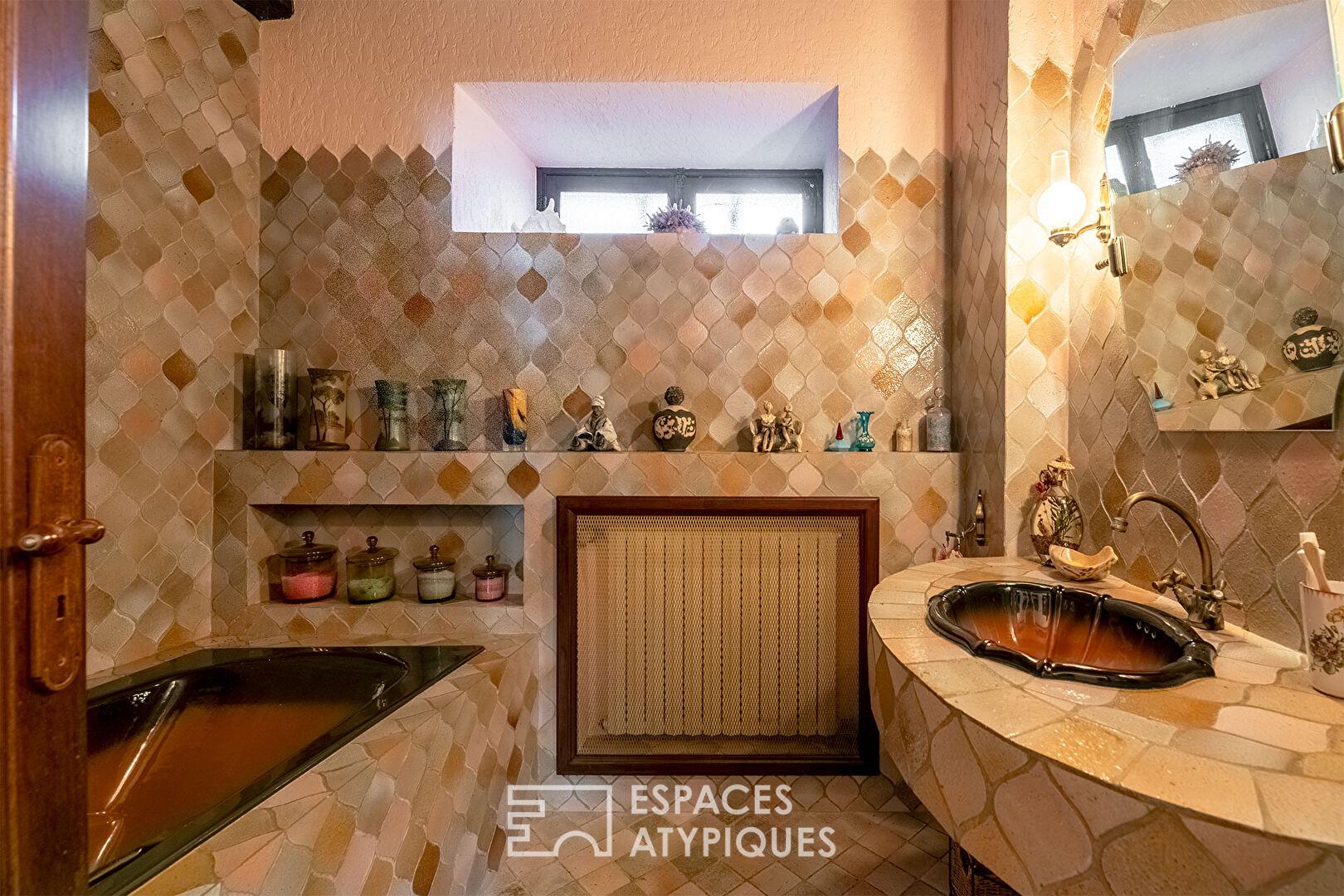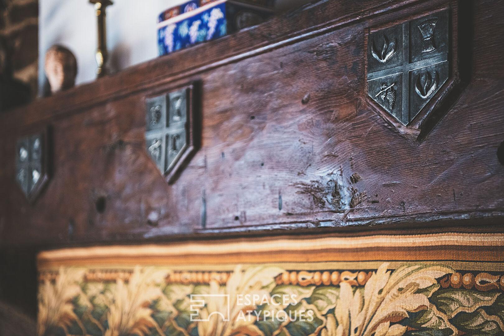 Depuis les robinets en cuivre qui semblent conçus pour verser de l’hydromel jusqu’aux blasons sculptés au dessus de l’imposante cheminée, cette maison a ses moments de frivolité.