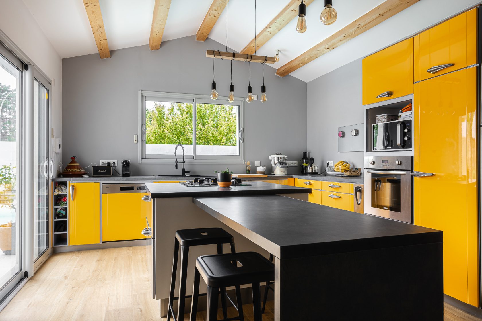 Dans le prolongement, la cuisine profite d’un beau volume grâce au plafond rampant et dispose d’un accès à la terrasse du jardin.