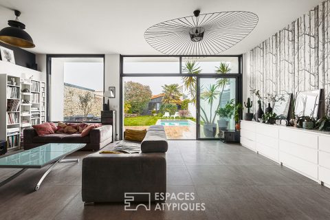 L’escalier, élément architectural fort, allie structure métallique et marches en bois, apportant du dynamisme à la pièce. A l’étage, un palier dessert trois chambres dont une avec dressing privatif ainsi qu’une salle d’eau.