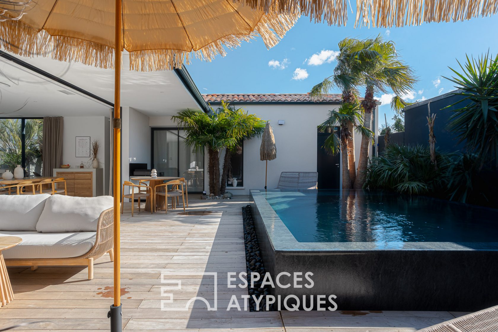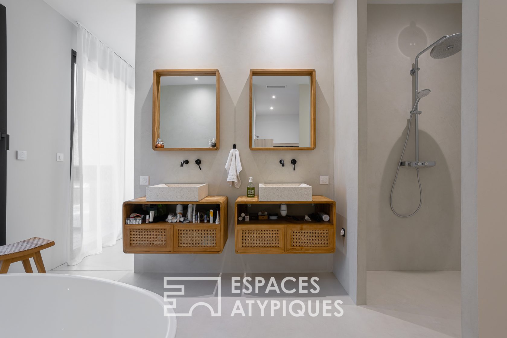 La maison est organisée autour d’un magnifique patio végétalisé avec une piscine à débordement, offrant un lieu de détente parfait pour les journées ensoleillées. La surface de la pièce de vie ouverte de 70 m2 environ en fait une pièce idéale pour recevoir les invités et profiter de la vue imprenable sur le patio.