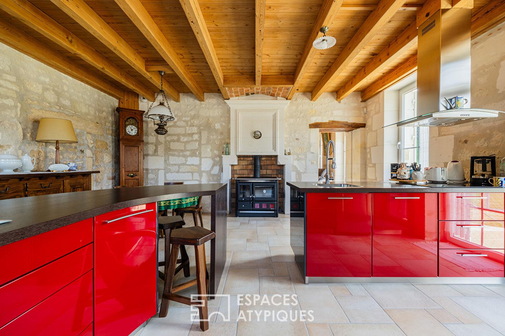 La maison principale développe environ 186 m2 habitables. Dès l’entrée, la vaste cuisine, pensée comme une véritable pièce de vie, accueille les moments de convivialité autour d’une authentique cuisinière à bois Nordica, idéale pour les amateurs de cuisine et d’atmosphères chaleureuses.