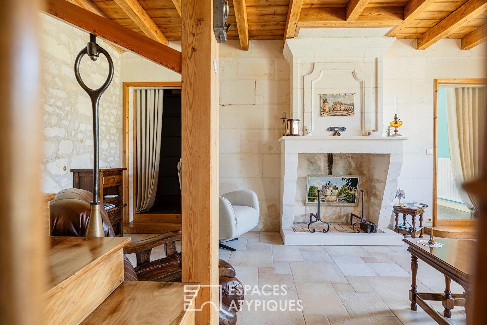 Dans son prolongement, un salon agrémenté d’une cheminée ancienne invite à la détente. Un détail architectural rare attire le regard : une ouverture en demi-lune permettant d’observer la turbine hydraulique et la poulie du moulin, subtilement mises en valeur et témoins du passé industriel du lieu.