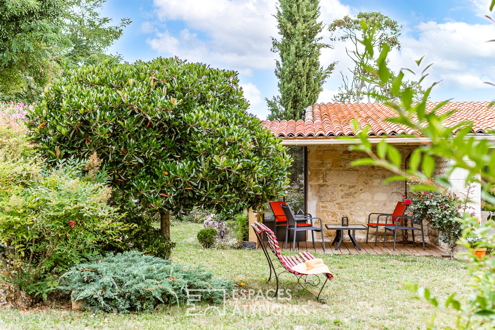 Le jardin clos de murs d’environ 700 m2 est un véritable havre de paix conçu avec différents espaces de détente et de beaux espaces fleuris.