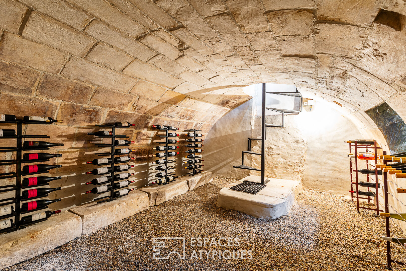 Belle surprise, l’authentique cave voutée de 20m² sous le salon est accessible par un élégant escalier en métal, alors qu’un garage de 35 m2 et un parking pour quatre véhicules complètent le bien.