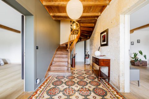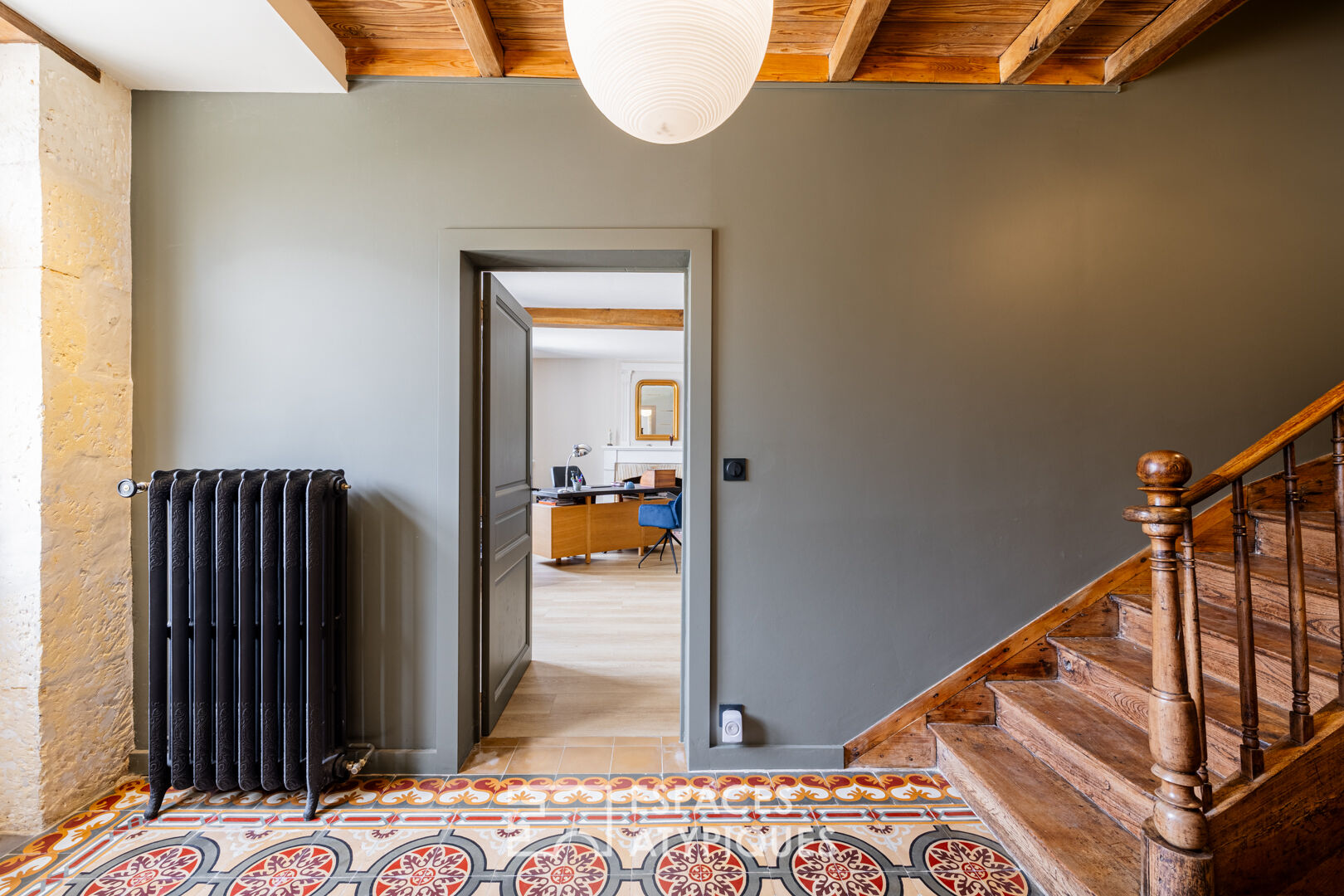 Dès l’entrée, le ton est donné : de jolis carreaux de ciment au sol et un escalier en bois admirablement travaillé reflètent l’élégance et le caractère authentique de cette demeure.
