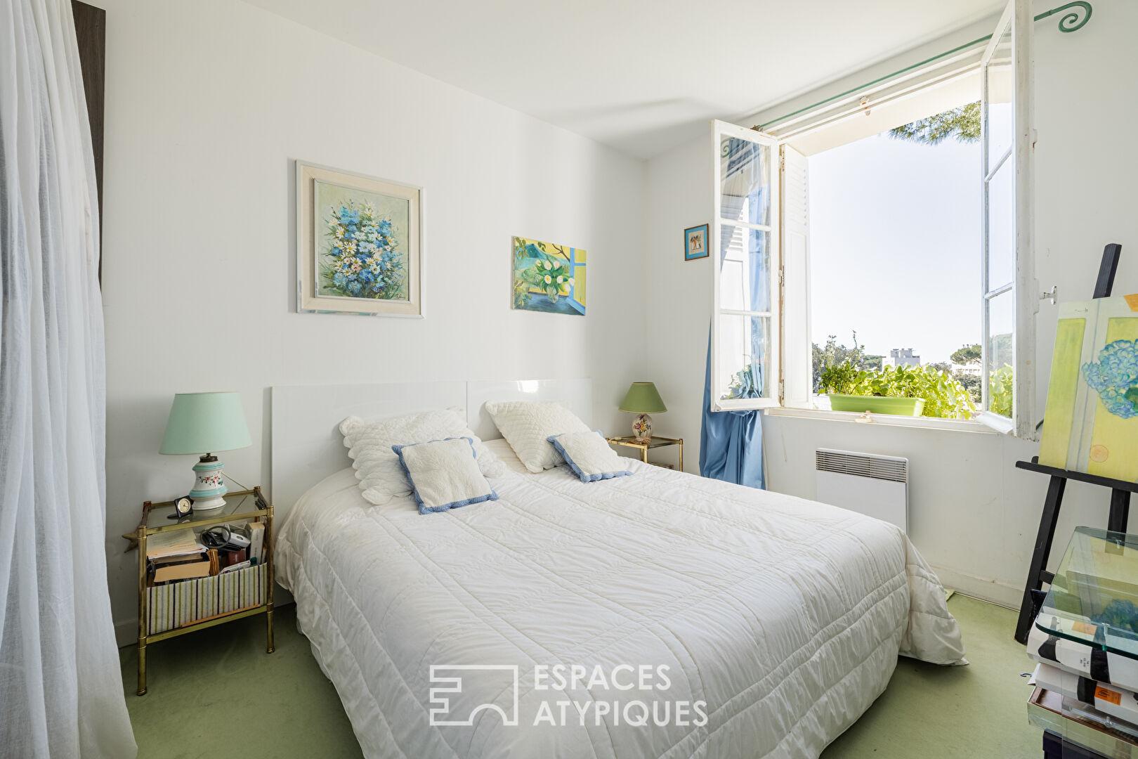 Les espaces intérieurs bénéficient d’une luminosité remarquable, grâce à une orientation idéale et à de nombreuses ouvertures sur l’extérieur. Les sols en parquet d’origine apportent un charme indéniable et une chaleur naturelle. Actuellement aménagé avec une cuisine indépendante, une salle à manger ouverte sur un balcon discret laissant entrevoir les reflets de la mer au loin, un salon cosy et trois chambres, ce plateau présente un potentiel de rénovation rare. Grâce à ses nombreux points d’eau existants, une reconfiguration est aisée pour créer deux à trois véritables suites confortables tout en conservant des volumes de réception généreux.